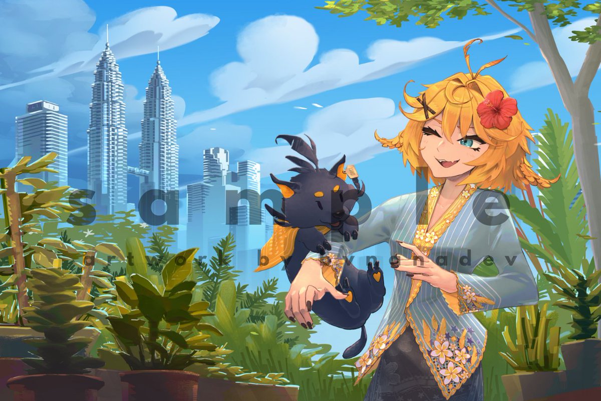 1girl blonde_hair blue_eyes bvnanadev commentary doki_amber_doge_(dokibird) dokibird dokibird_(bounty_hunter) english_commentary flower hair_flower hair_ornament hibiscus indie_virtual_youtuber kebaya outdoors petronas_twin_towers plant potted_plant sample_watermark short_hair sky smile virtual_youtuber watermark x_hair_ornament