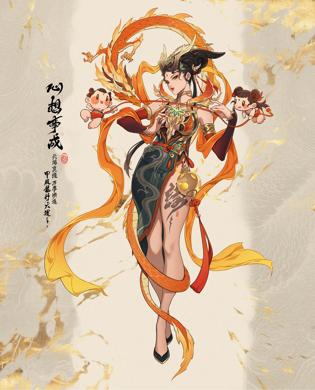 1girl black_hair china_dress chinese_clothes citemer dragon dragon_girl dragon_horns dragon_tail dress eastern_dragon highres horns leotard long_hair long_legs original solo tail