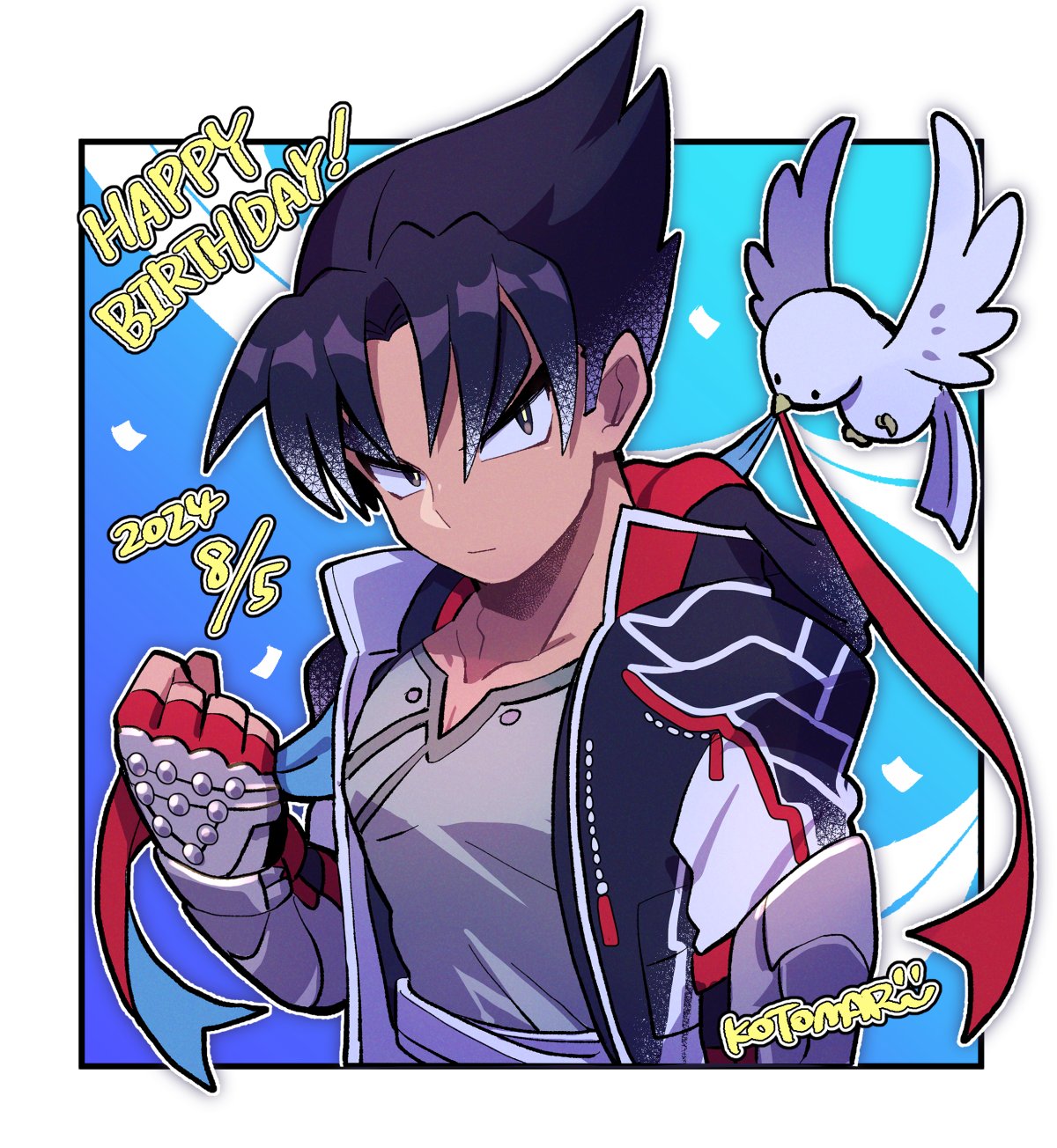 1boy bird black_hair black_jacket border closed_mouth collarbone fingerless_gloves gloves grey_shirt happy_birthday highres jacket kazama_jin kotomaru_(kotokoto_kottan) looking_at_viewer male_focus red_ribbon ribbon shirt short_hair signature solo studded_gloves tekken tekken_8 upper_body white_bird white_border