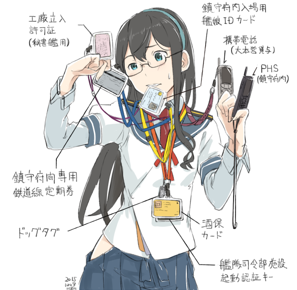 1girl black_hair blue_eyes blue_headband blue_skirt cellphone cowboy_shot glasses headband holding holding_id_card holding_phone id_card kantai_collection kawashina_(momen_silicon) lanyard long_hair long_sleeves mouth_hold ooyodo_(kancolle) phone pleated_skirt school_uniform serafuku shirt simple_background skirt solo sweatdrop teeth_hold translation_request white_background white_shirt