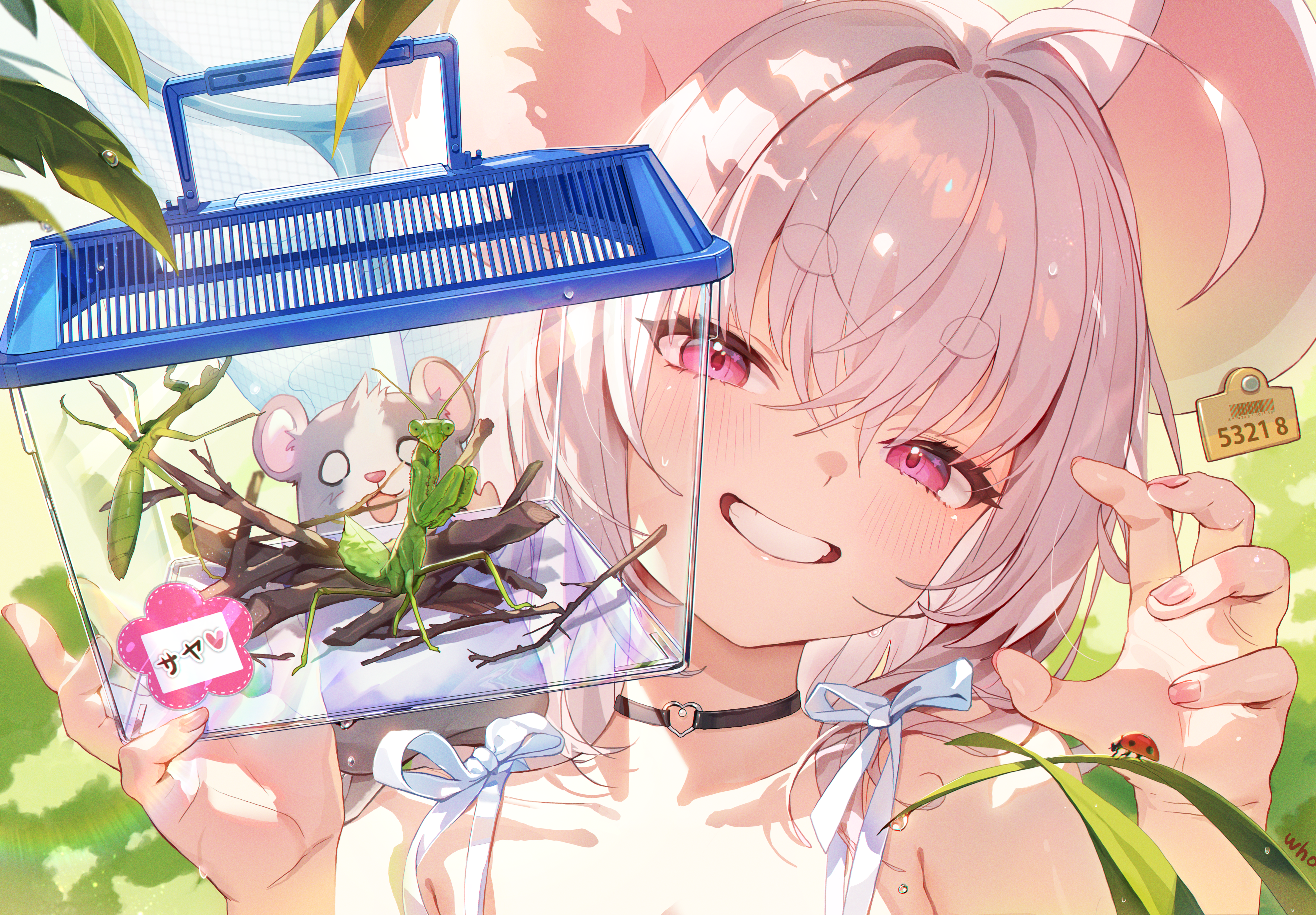 1girl absurdres animal_ears blue_archive bug choker ear_tag grass grey_hair grin heart heart_choker highres insect ladybug long_hair mouse_(animal) mouse_ears mouse_girl nezusuke_(blue_archive) praying_mantis red_eyes saya_(blue_archive) smile stick whoisshe