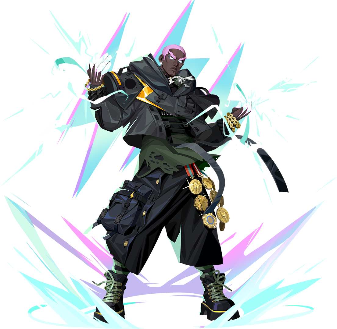 1boy artist_request black_boots black_shorts boots bracelet chain chain_bracelet dark-skinned_male dark_skin dislyte earrings face_piercing floating_clothes gaius_(zeus)_(dislyte) glowing glowing_eyes glowing_markings gold_bracelet jewelry lightning_bolt_symbol lip_piercing male_focus medal official_art piercing pink_hair shirt short_hair shorts silver_chain solo streetwear stud_earrings third-party_source torn_clothes torn_shirt very_short_hair