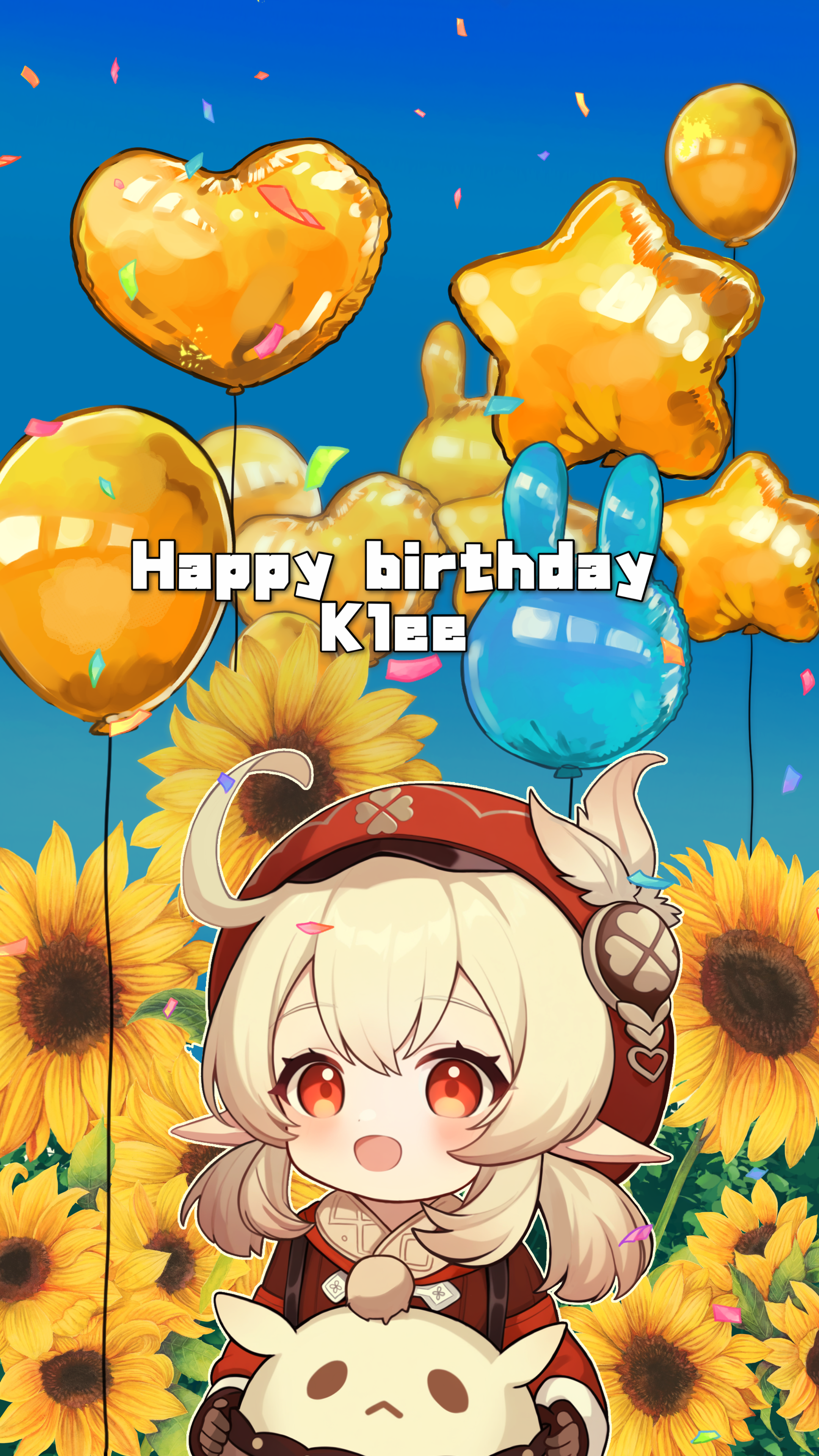 1girl :< :d absurdres ahoge balloon blonde_hair blue_sky brown_gloves brown_scarf newsboy_cap character_name child clover clover_print confetti deformed english_text field flower flower_field four-leaf_clover fuminshou_(nekopan_art) genshin_impact gloves gradient_sky hair_between_eyes happy_birthday hat hat_feather heart_balloon highres holding jumpy_dumpty klee_(genshin_impact) light_blush long_sleeves looking_at_viewer low_twintails medium_hair open_mouth outdoors outline pointy_ears pom_pom_(clothes) puffy_long_sleeves puffy_sleeves raised_eyebrows red_eyes red_hat red_sweater scarf sidelocks sky smile star_balloon sunflower sweater tareme twintails white_outline