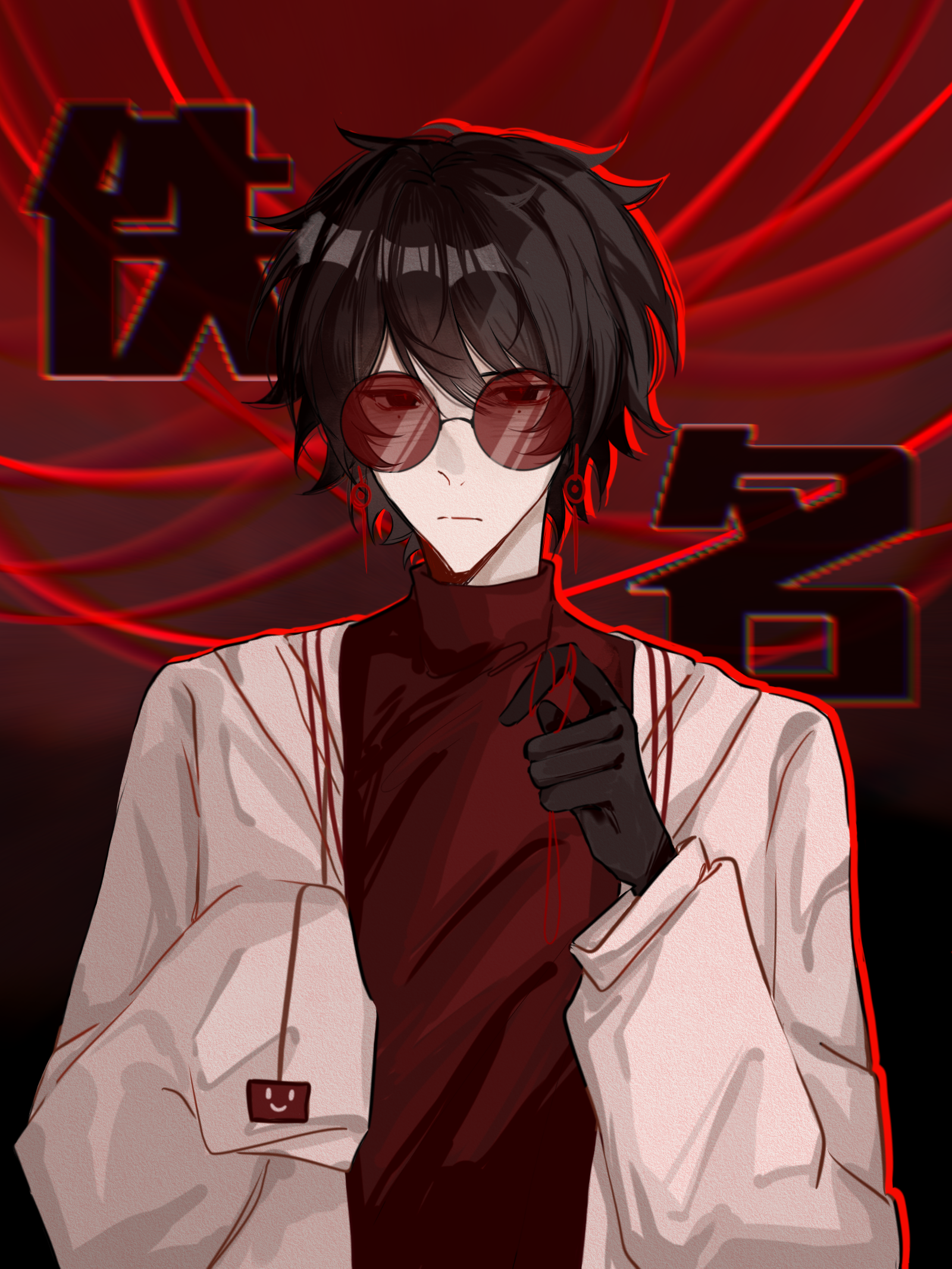 1boy baimi33 black_eyes black_gloves black_hair chinese_text closed_mouth commentary earrings gloves highres jacket jewelry li_yuting_(male) long_sleeves male_focus mole mole_under_each_eye mole_under_eye multiple_moles open_clothes open_jacket red-tinted_eyewear red_background red_sweater round_eyewear short_hair single_sleeve_past_fingers solo sweater untranslatable_commentary tinted_eyewear touqi_guaitan translation_request turtleneck turtleneck_sweater upper_body white_jacket