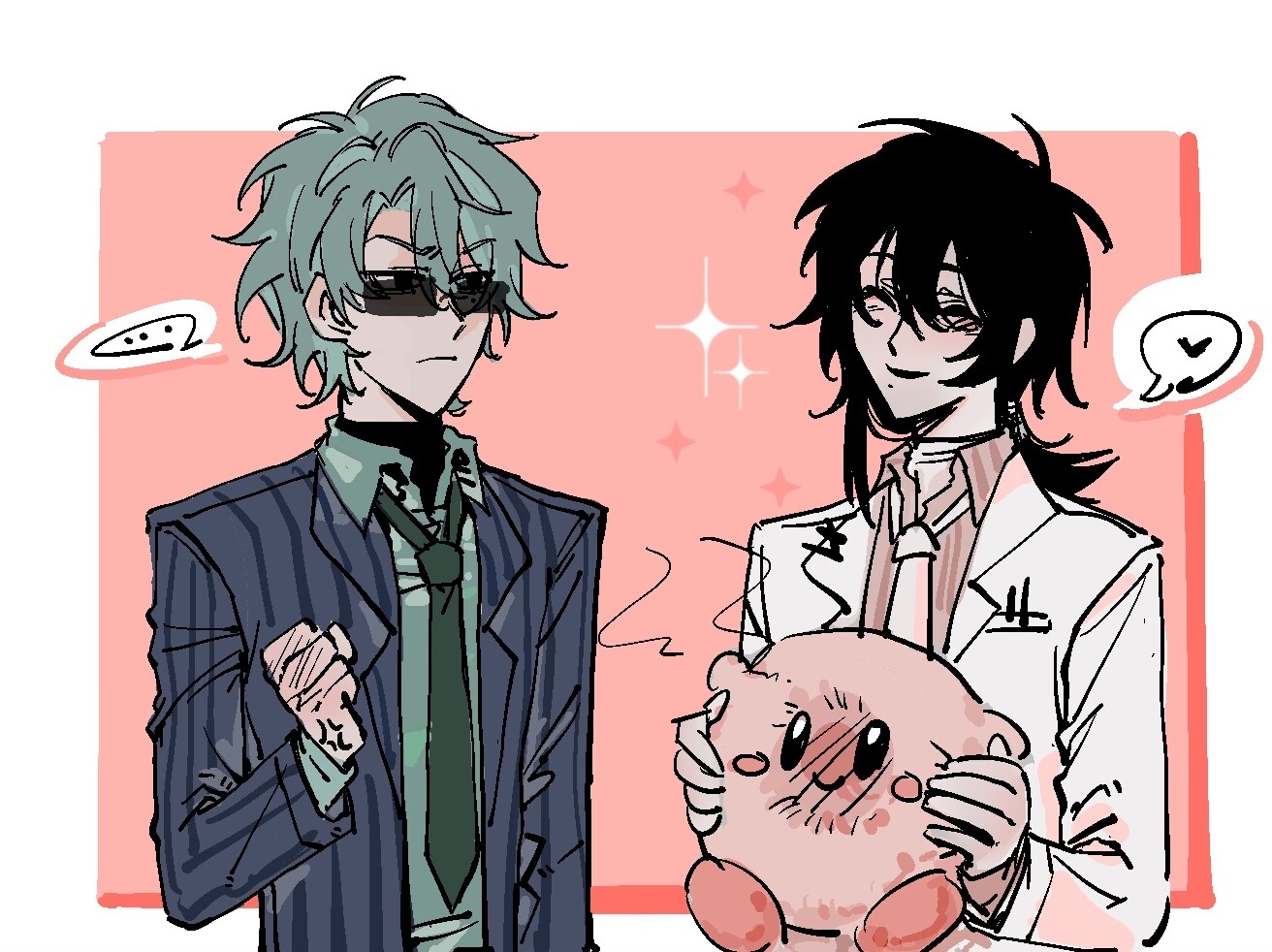 ... 2boys anger_vein black_hair blue_jacket chinese_commentary clenched_hand closed_eyes collared_shirt commentary_request green_hair green_necktie green_shirt hair_between_eyes heart jacket kirby kirby_(series) lab_coat liu_qingcheng long_sleeves male_focus mo_chengwei mole mole_under_mouth multiple_boys necktie niangao489 nintendo open_clothes open_jacket open_mouth pink_shirt rectangular_eyewear shirt short_hair smile sparkle spoken_ellipsis spoken_heart striped_clothes striped_jacket sunglasses touqi_guaitan turtleneck upper_body vertical-striped_clothes vertical-striped_jacket white_necktie