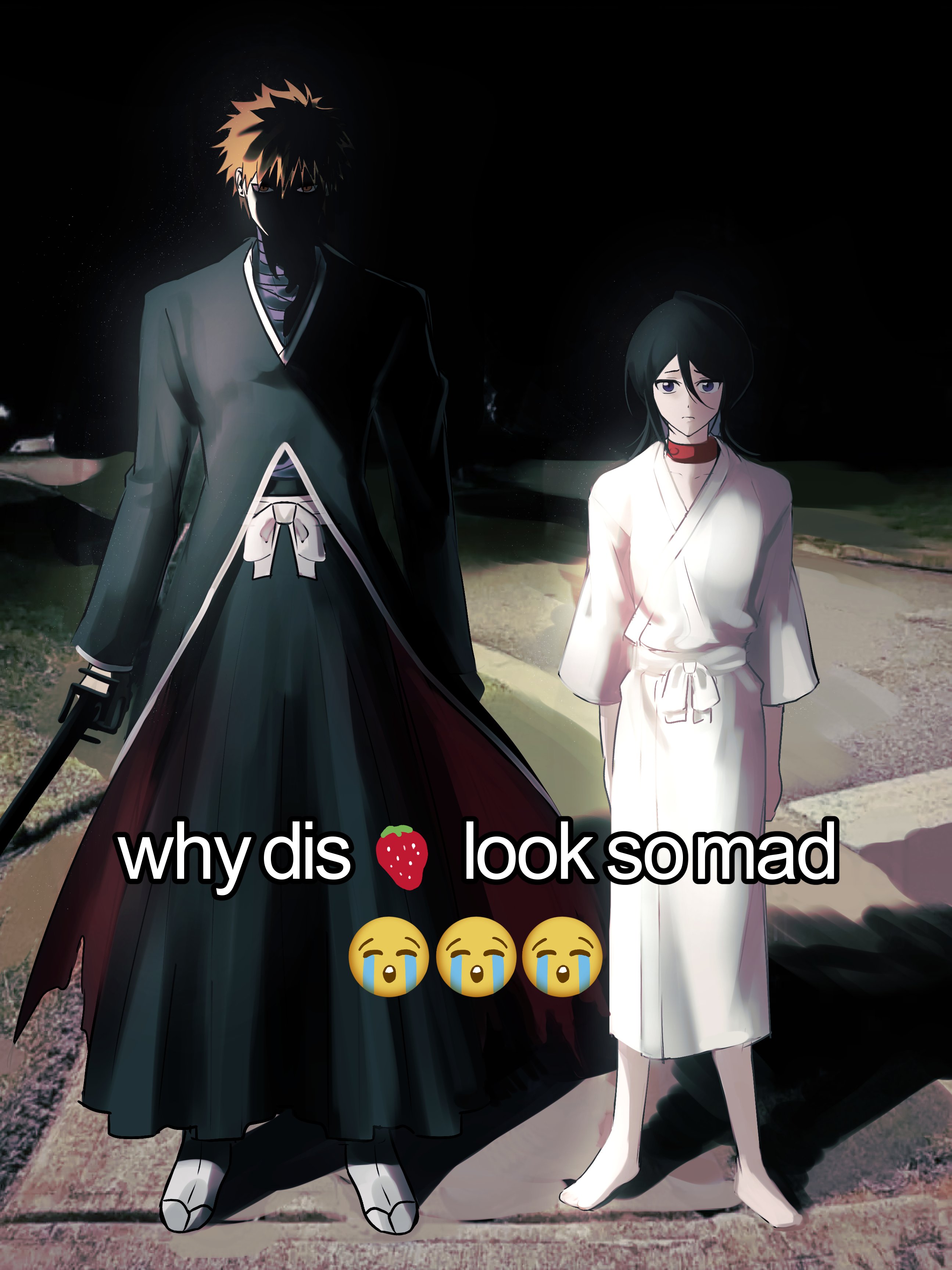 1boy 1girl absurdres arms_at_sides barefoot black_hair black_hakama black_kimono bleach brown_eyes choker closed_mouth commentary crying_emoji emoji english_text food frown fruit full_body gwao_(_ul_13) hair_between_eyes hakama hashtag-only_commentary highres holding holding_sword holding_weapon japanese_clothes kimono kuchiki_rukia kurosaki_ichigo long_sleeves looking_at_viewer medium_hair meme night orange_hair outdoors purple_eyes raised_eyebrows red_choker sanpaku shaded_face short_hair side-by-side spiked_hair standing straight_hair strawberry sword tabi tensa_zangetsu_(bankai) tsurime weapon white_kimono why_dis_ninja_look_so_mad_(meme) wide_sleeves