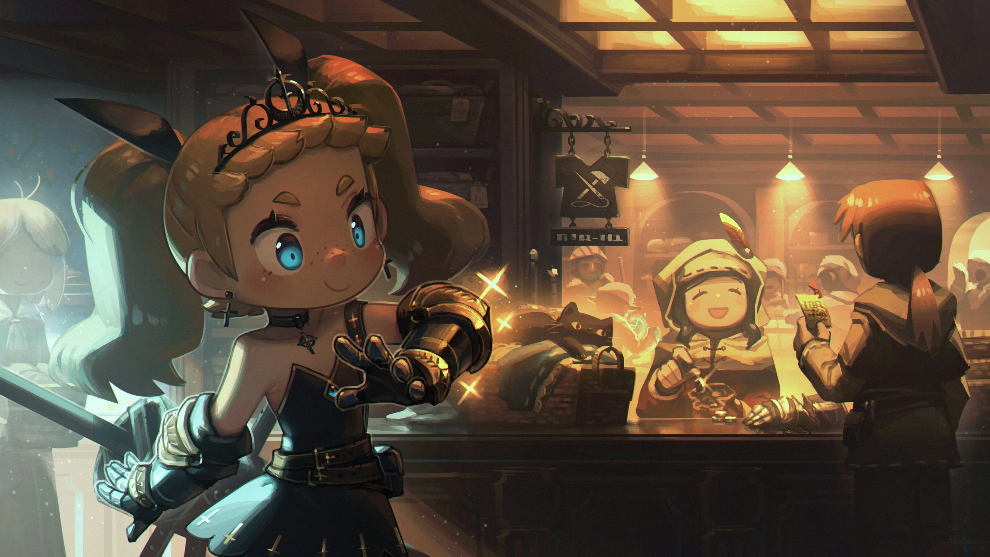 1boy 3girls absurdres basket belt belt_pouch blonde_hair blue_eyes brown_hair cat choker coin commentary cressey_(porforever) cross cross_earrings cross_print dress earrings english_commentary fantasy freckles gauntlets gold_coin hair_ribbon highres indoors jewelry low_ponytail multiple_girls original ponytail porforever pouch ribbon shop sign tiara twintails