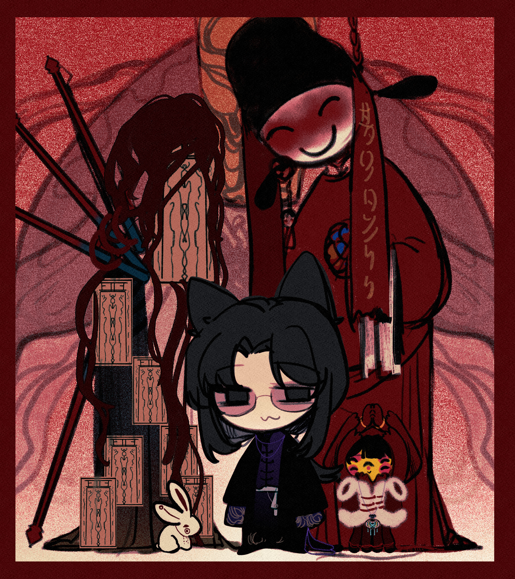 :3 black_eyes black_hair black_jacket chibi chibi_only chinese_commentary closed_mouth commentary_request highres huai_yunqing jacket kemonomimi_mode long_hair long_sleeves male_focus muluo_cantu official_art open_mouth outline parted_bangs pink-tinted_eyewear purple_shirt qianxian_(touqi_guaitan) rabbit red_outline round_eyewear shenggong_(touqi_guaitan) shirt tinted_eyewear touqi_guaitan xiaohuaao_(touqi_guaitan)
