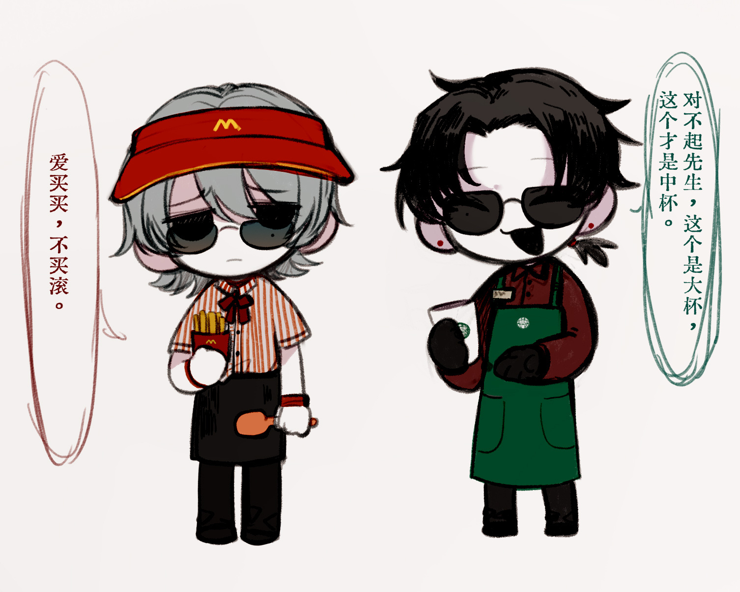 2boys apron black_apron black_eyes black_gloves black_hair black_pants chibi chibi_only chinese_commentary chinese_text closed_eyes closed_mouth collared_shirt commentary_request earrings employee_uniform fast_food_uniform food french_fries gloves green_apron grey_hair highres jewelry liu_qingcheng long_sleeves male_focus mcdonald's medium_hair mole mole_under_eye multiple_boys muluo_cantu neck_ribbon official_art open_mouth pants red_ribbon red_shirt ribbon shirt short_sleeves simple_background smile starbucks striped_clothes striped_shirt stud_earrings sunglasses touqi_guaitan translation_request vertical-striped_clothes vertical-striped_shirt visor_cap waist_apron white_background white_gloves zhu_yaoxing