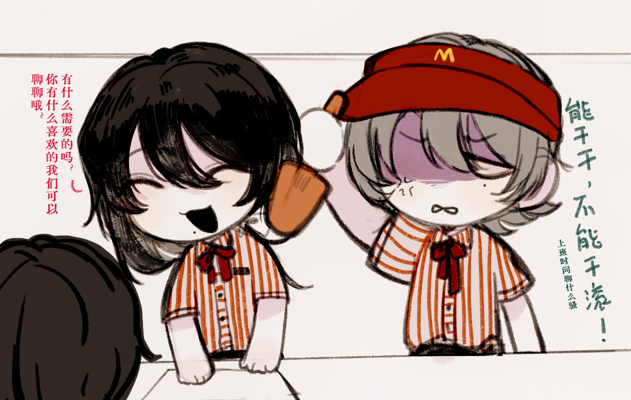 2boys :3 anger_vein black_hair chibi chibi_only chinese_commentary chinese_text collared_shirt commentary_request hair_between_eyes holding holding_spatula liu_qingcheng male_focus mcdonald's medium_hair mo_chengwei mole mole_under_eye mole_under_mouth multiple_boys muluo_cantu neck_ribbon official_art open_mouth red_ribbon ribbon shaded_face shirt short_sleeves smile spatula striped_clothes striped_shirt touqi_guaitan translation_request vertical-striped_clothes vertical-striped_shirt visor_cap white_shirt