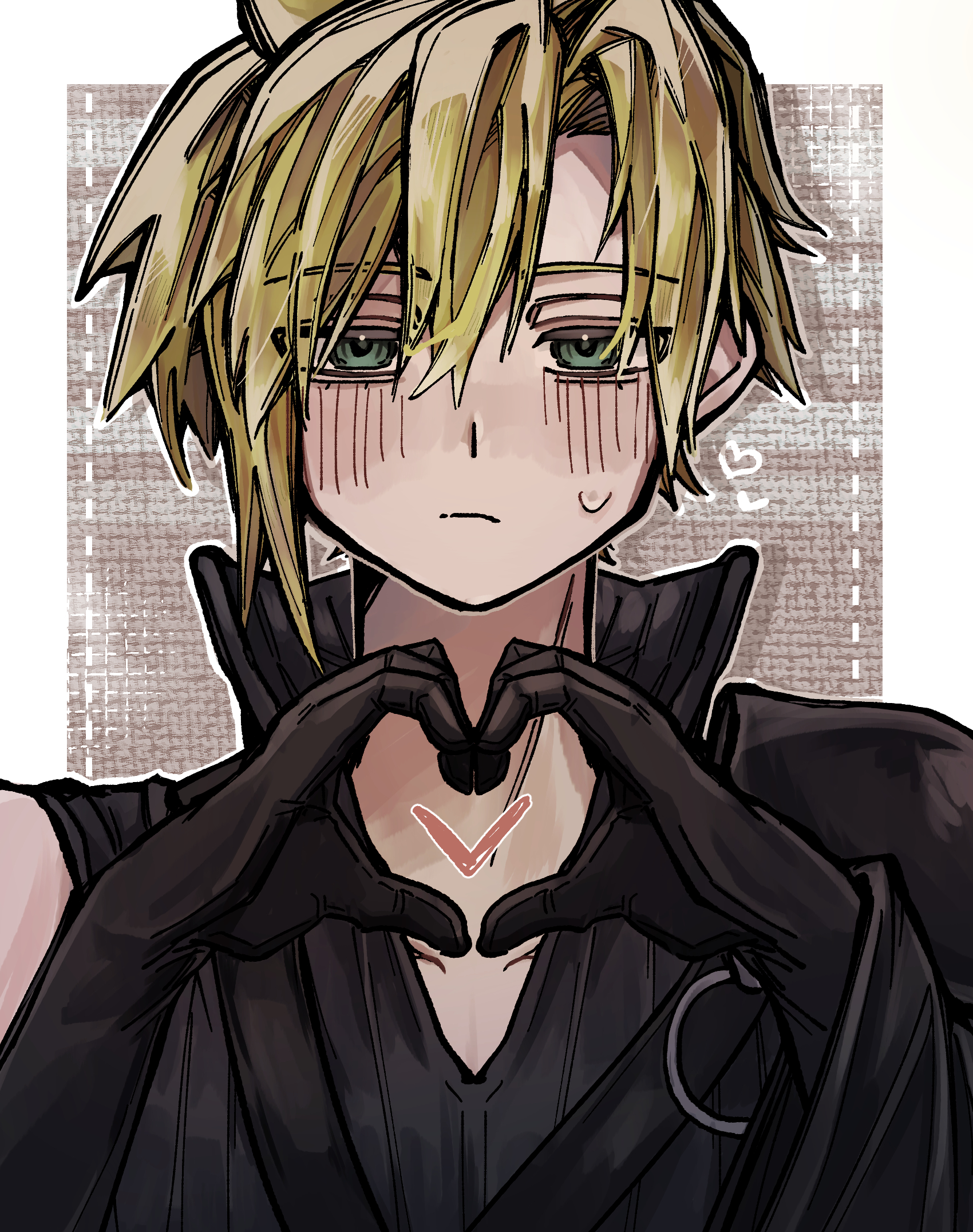 1boy armor black_gloves black_sleeves black_vest blonde_hair blush border brown_background cloud_strife final_fantasy final_fantasy_vii final_fantasy_vii:_advent_children gloves green_eyes hair_between_eyes heart heart_hands highres kawa_2929_ff looking_at_viewer male_focus popped_collar short_hair shoulder_armor single_bare_shoulder single_shoulder_pad single_sleeve solo spiked_hair sweatdrop upper_body vest white_border