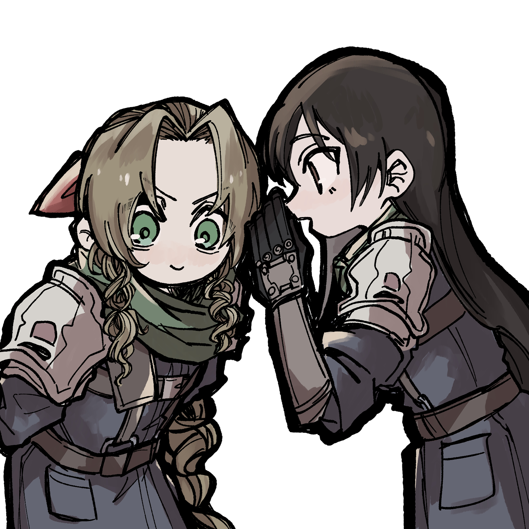 2girls aerith_gainsborough armor blue_shirt braid braided_ponytail brown_eyes brown_hair closed_mouth final_fantasy final_fantasy_vii final_fantasy_vii_rebirth final_fantasy_vii_remake green_eyes green_scarf hair_ribbon highres kawa_2929_ff leaning_forward light_blush long_hair long_sleeves multiple_girls official_alternate_costume open_mouth parted_bangs pink_ribbon ribbon scarf shinra_infantry_uniform shirt shoulder_armor sidelocks single_braid smile tifa_lockhart upper_body vambraces wavy_hair whispering_in_ear white_background