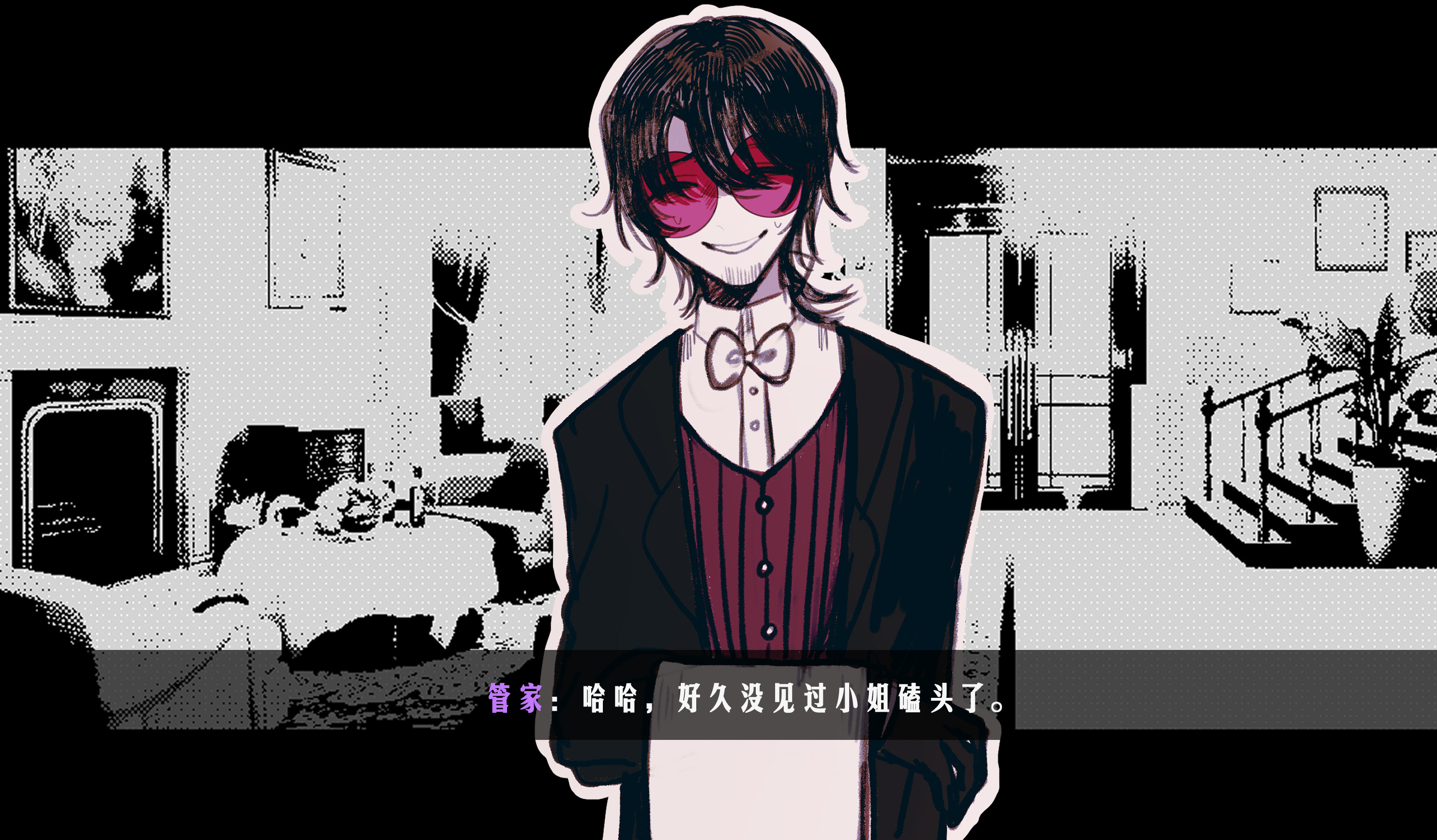 1boy beard_stubble black_gloves black_hair black_jacket bow bowtie chinese_commentary chinese_text collared_shirt commentary_request facial_hair gloves highres huai_yunqing jacket long_sleeves male_focus muluo_cantu official_art open_clothes open_jacket promotional_art red-tinted_eyewear red_vest round_eyewear shirt short_hair smile solo striped_clothes striped_vest stubble sweat tinted_eyewear touqi_guaitan translation_request upper_body vertical-striped_clothes vertical-striped_vest vest white_bow white_bowtie white_shirt