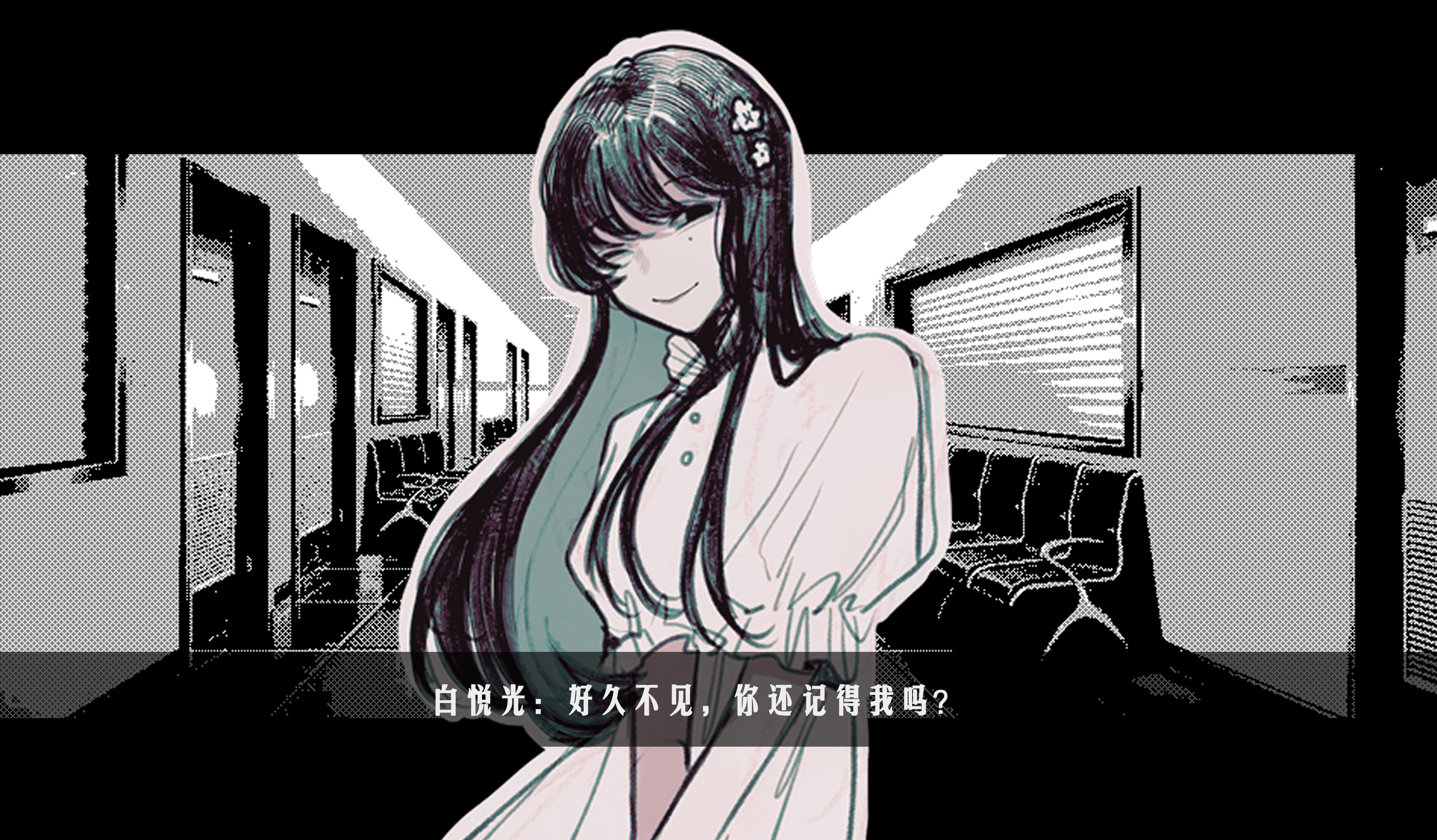 1boy black_eyes black_hair chinese_commentary chinese_text closed_mouth commentary_request crossdressing crossdressing_(mtf) dress flower frilled_sleeves frills hair_flower hair_ornament highres long_hair male_focus muluo_cantu official_art one_eye_closed promotional_art puffy_short_sleeves puffy_sleeves short_sleeves smile solo touqi_guaitan translation_request trap upper_body white_dress white_flower ziche_fuzhao