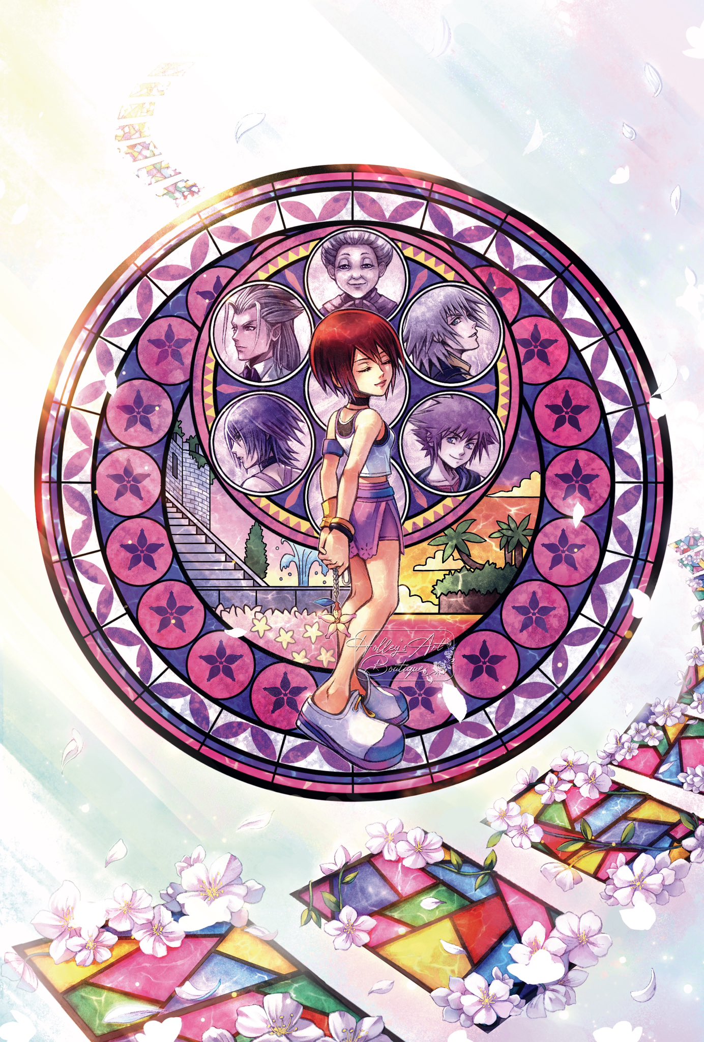 3boys 3girls aqua_(kingdom_hearts) arms_behind_back bare_shoulders black_choker black_shirt blue_hair bracelet breasts camisole choker closed_eyes flower fountain full_body grandmother_and_granddaughter grey_hair hair_between_eyes hair_slicked_back highres hollypolllyy jewelry kairi_(kingdom_hearts) kingdom_hearts long_hair medium_hair midriff multiple_boys multiple_girls nomura_tetsuya_(style) own_hands_together palm_tree paopu_fruit parted_bangs pink_skirt red_hair riku_(kingdom_hearts) shirt short_hair skirt small_breasts sora_(kingdom_hearts) stained_glass stairs tree white_camisole white_flower white_footwear white_shirt wristband xemnas yellow_flower
