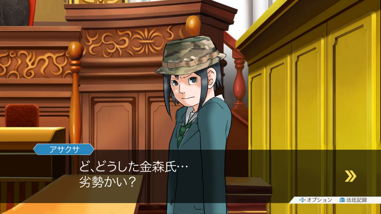 1girl ace_attorney asakusa_midori black_eyes black_hair bucket_hat camouflage camouflage_headwear character_name courtroom dialogue_box eizouken_ni_wa_te_wo_dasu_na! green_necktie hat highres m0s0z necktie parody school_uniform shibahama_high_school_uniform short_hair user_interface