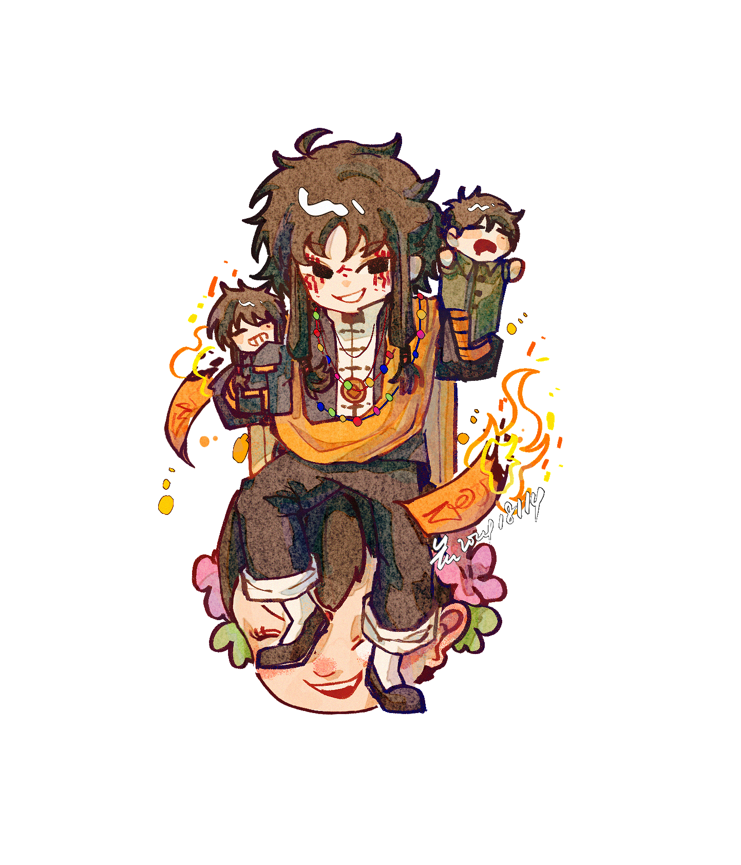 1boy bandaged_arm bandaged_leg bandages black_eyes black_hair black_jacket black_pants black_shoes burning chinese_commentary commentary_request facial_tattoo hand_puppet highres jacket long_sleeves low-tied_sidelocks male_focus mole mole_under_eye ofuda open_clothes open_jacket pants puppet shirt shoes short_hair_with_long_locks sidelocks simple_background sitting socks solo tattoo touqi_guaitan white_background white_shirt white_socks ygclmss ziche_fuzhao