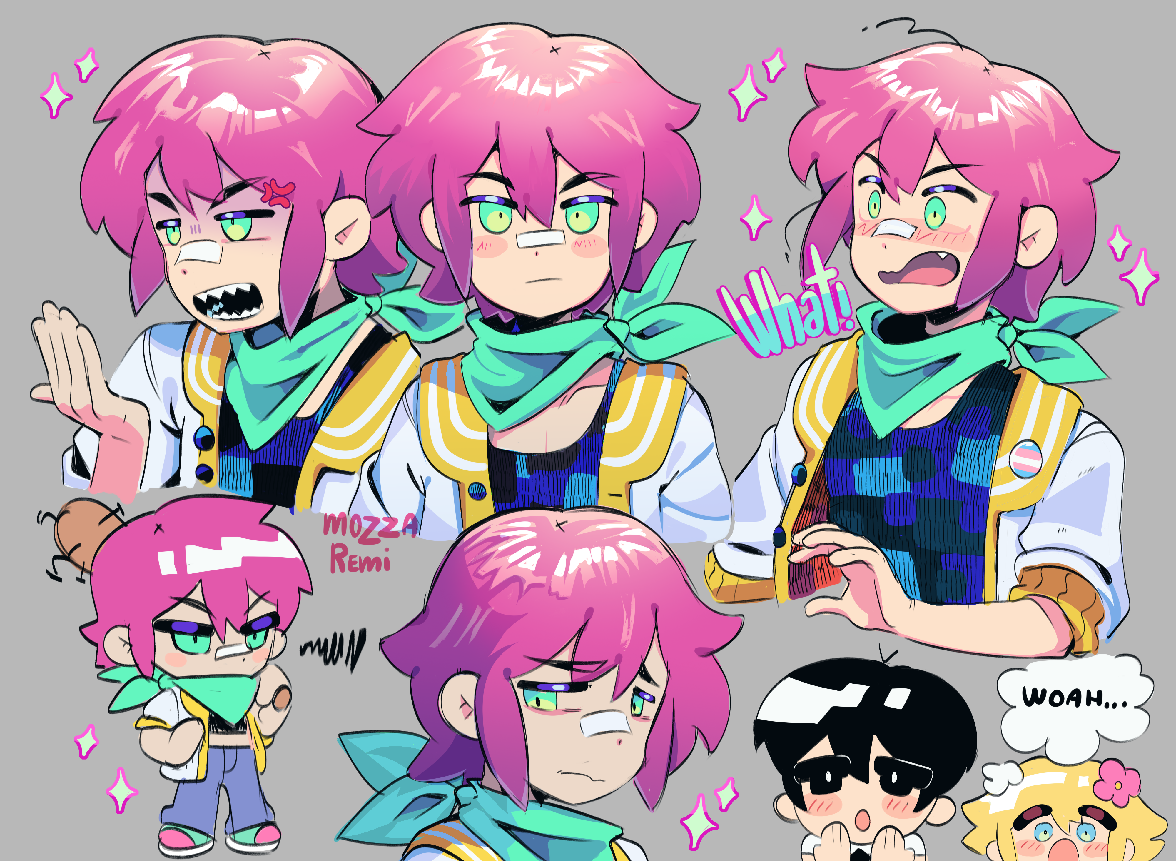 3boys absurdres alternate_hair_length alternate_hairstyle aubrey_(faraway)_(omori) aubrey_(omori) bandaid bandaid_on_face bandaid_on_nose bandana bandana_around_neck baseball_bat basil_(faraway)_(omori) basil_(omori) black_eyes black_hair blonde_hair blue_eyes bright_pupils closed_mouth collarbone fang flower genderswap genderswap_(ftm) green_bandana green_eyes hair_flower hair_ornament highres holding holding_baseball_bat jacket lgbt_pride looking_at_another looking_at_viewer male_focus multiple_boys nail_(hardware) nail_bat omori open_mouth parted_lips pink_hair remi_(mozzaremi) sharp_teeth short_hair sparkle sunny_(omori) teeth transgender_flag white_jacket white_pupils