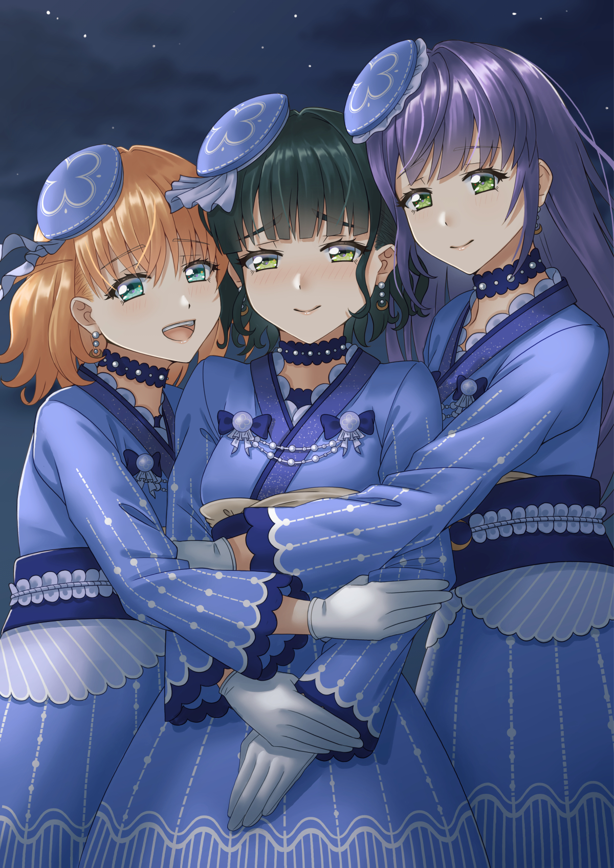 3girls :d aqua_eyes beret black_hair blue_choker blue_hat blue_kimono blue_skirt blunt_bangs blush breasts cerise_bouquet choker closed_mouth commentary_request cowboy_shot crescent crescent_earrings crossed_bangs earrings gloves green_eyes group_hug hair_down hat highres hinoshita_kaho hug japanese_clothes jewelry kimono link!_like!_love_live! long_hair long_sleeves looking_at_viewer love_live! medium_breasts medium_hair momose_ginko multiple_girls night nose_blush official_alternate_costume official_alternate_hairstyle open_mouth orange_hair otomune_kozue purple_hair sano_souichi short_hair sidelocks skirt sky smile teeth tilted_headwear tsukuyomi_kurage two_side_up upper_teeth_only virtual_youtuber white_gloves