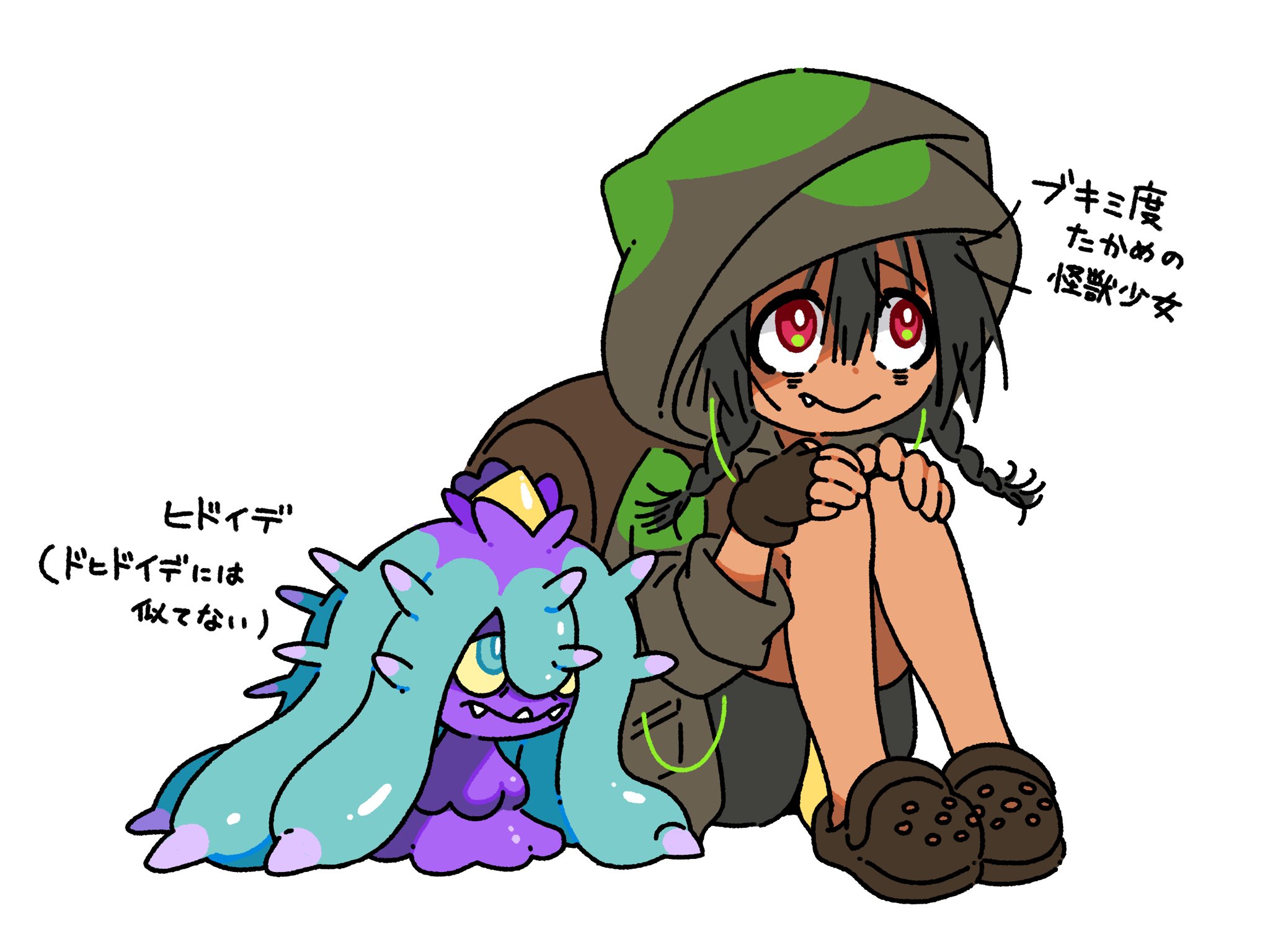 1girl anosillus_ii black_hair blue_eyes braid colored_sclera dark_skin fangs fingerless_gloves gen_7_pokemon gloves gridman_universe highres hood hood_up long_hair mareanie nintendo pokemon pokemon_(creature) red_eyes simple_background sitting spikes ssss.gridman sukoshi_semashi teeth twin_braids