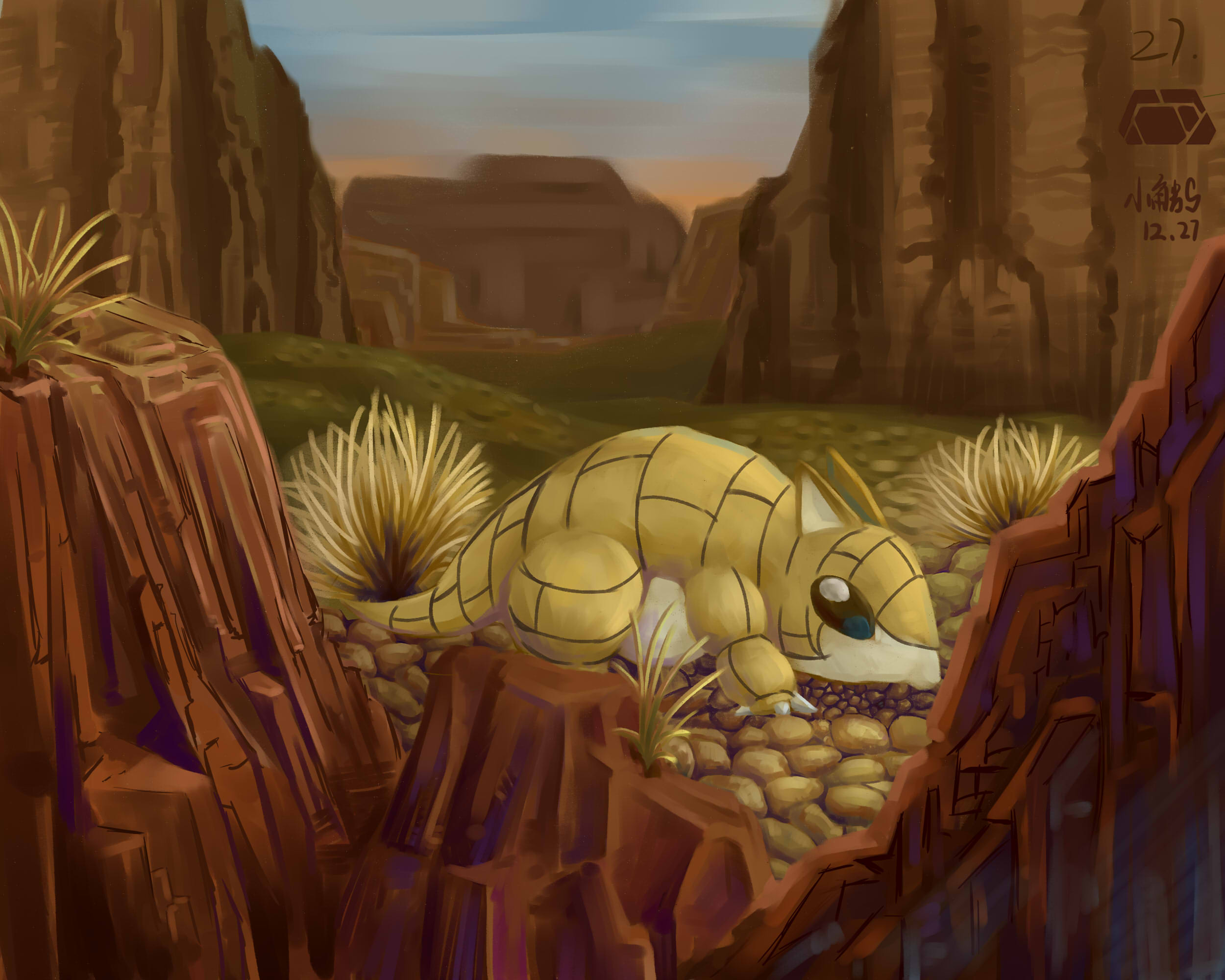 animal_focus artist_logo black_eyes bright_pupils bush canyon claws dated dusk full_body gen_1_pokemon highres logo michito_(numu8554) mountain nintendo no_humans outdoors pokemon pokemon_(creature) rock sandshrew signature solo white_pupils