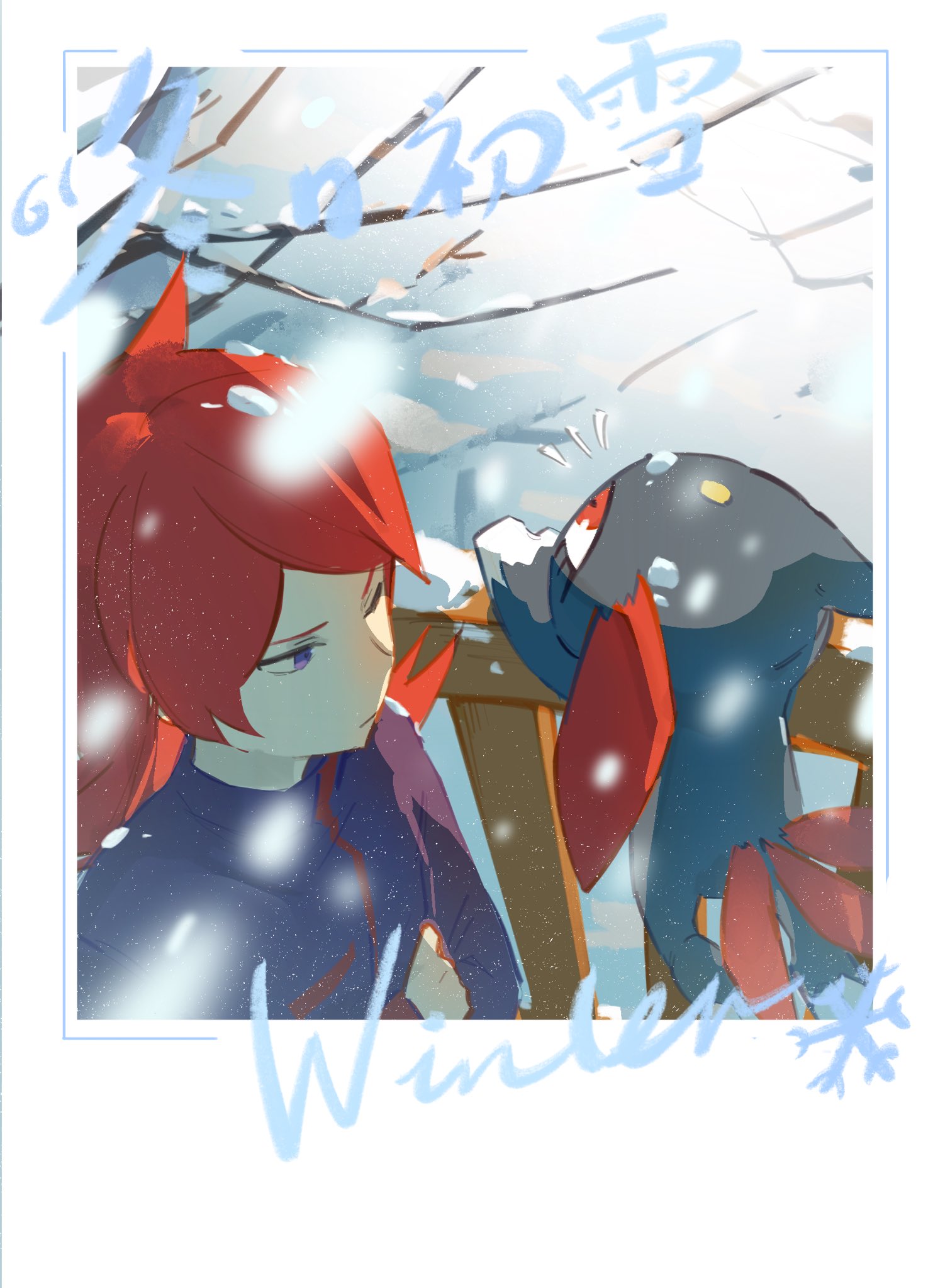 1boy bare_tree black_fur black_jacket cowlick crossed_arms english_text eyelashes feathers forehead_jewel gem gen_2_pokemon highres jacket krg_0603 male_focus nintendo notice_lines photo_(object) pokemon pokemon_(creature) pokemon_heartgold_and_soulsilver purple_eyes railing red_eyes red_feathers red_hair short_hair silver_(pokemon) sneasel snow snowflakes snowing tree winter yellow_gem