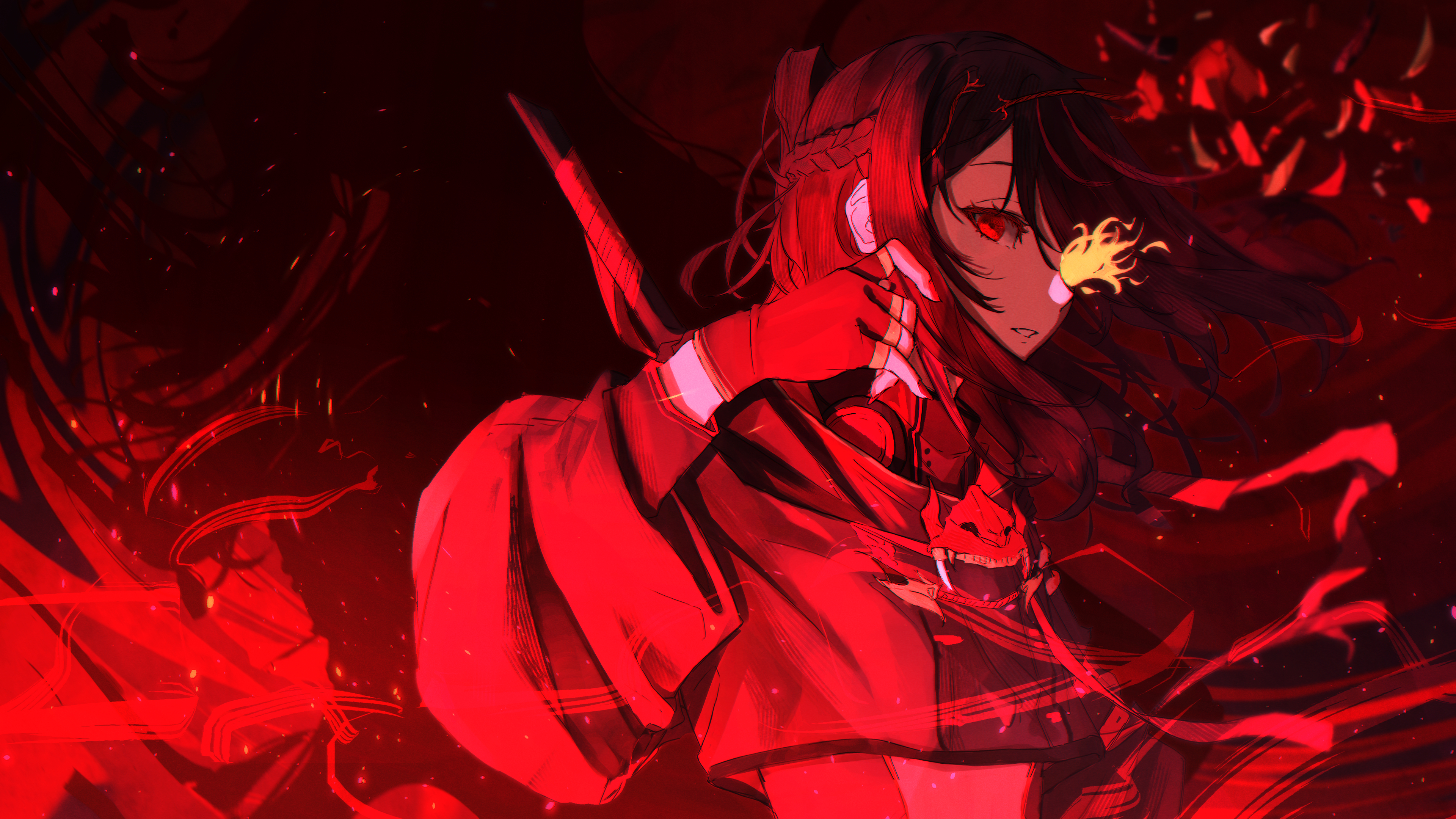 1girl absurdres bodysuit braid fingerless_gloves flaming_eye gloves headphones highres iris_black_games kisaragi_ren_(4th_costume)_(vspo!) kisaragi_ren_(vspo!) light_particles looking_at_viewer mask medium_hair official_alternate_costume official_alternate_hairstyle oni_mask parted_lips red_theme sidelocks solo soramick sword sword_on_back upper_body virtual_youtuber vspo! weapon weapon_on_back wide_sleeves