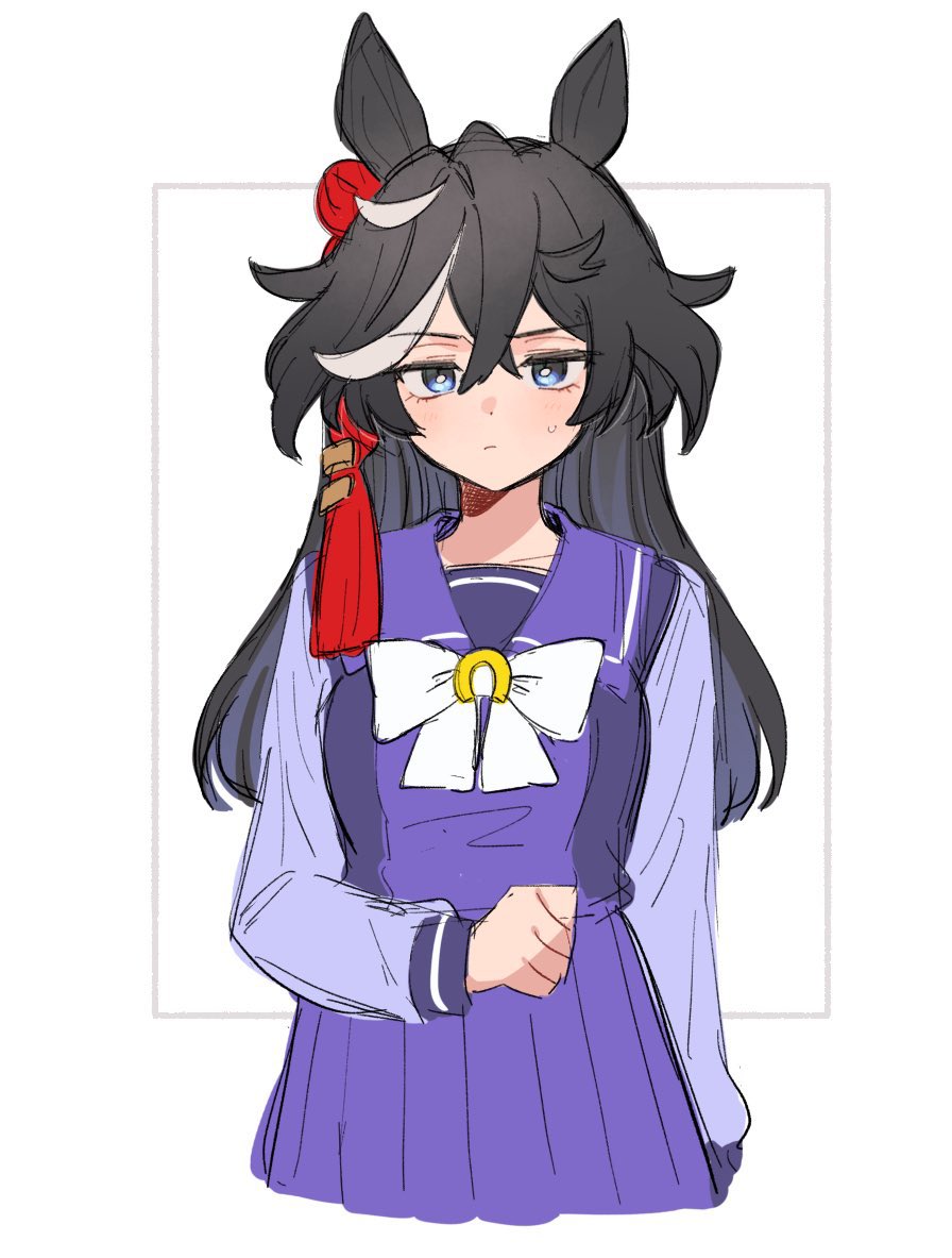 1girl acta_0907 alternate_hairstyle animal_ears black_hair blue_eyes bow ear_covers hair_between_eyes hair_ornament horse_ears horse_girl horseshoe_ornament jacket katsuragi_ace_(umamusume) long_hair long_sleeves looking_at_viewer multicolored_hair ponytail purple_shirt sailor_collar sailor_shirt school_uniform shirt solo streaked_hair tassel tassel_hair_ornament tracen_school_uniform umamusume white_hair