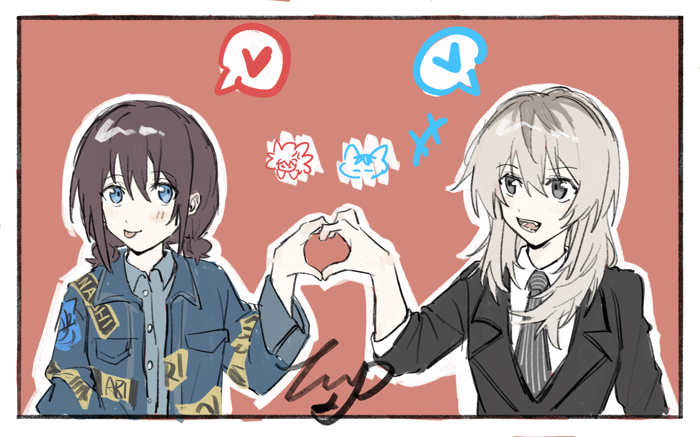 +++ 2girls black_jacket black_necktie blue_eyes blue_jacket blue_shirt blush brown_hair collared_shirt commentary_request dress_shirt fang fish_(sakana135026) girls_band_cry grey_eyes grey_hair hair_between_eyes heart heart_hands heart_hands_duo highres iseri_nina jacket kawaragi_momoka long_hair low_twintails multicolored_hair multiple_girls necktie open_clothes open_jacket open_mouth outline roots_(hair) shirt short_hair short_twintails striped_clothes striped_necktie teeth three-quarter_sleeves tongue tongue_out twintails white_outline white_shirt