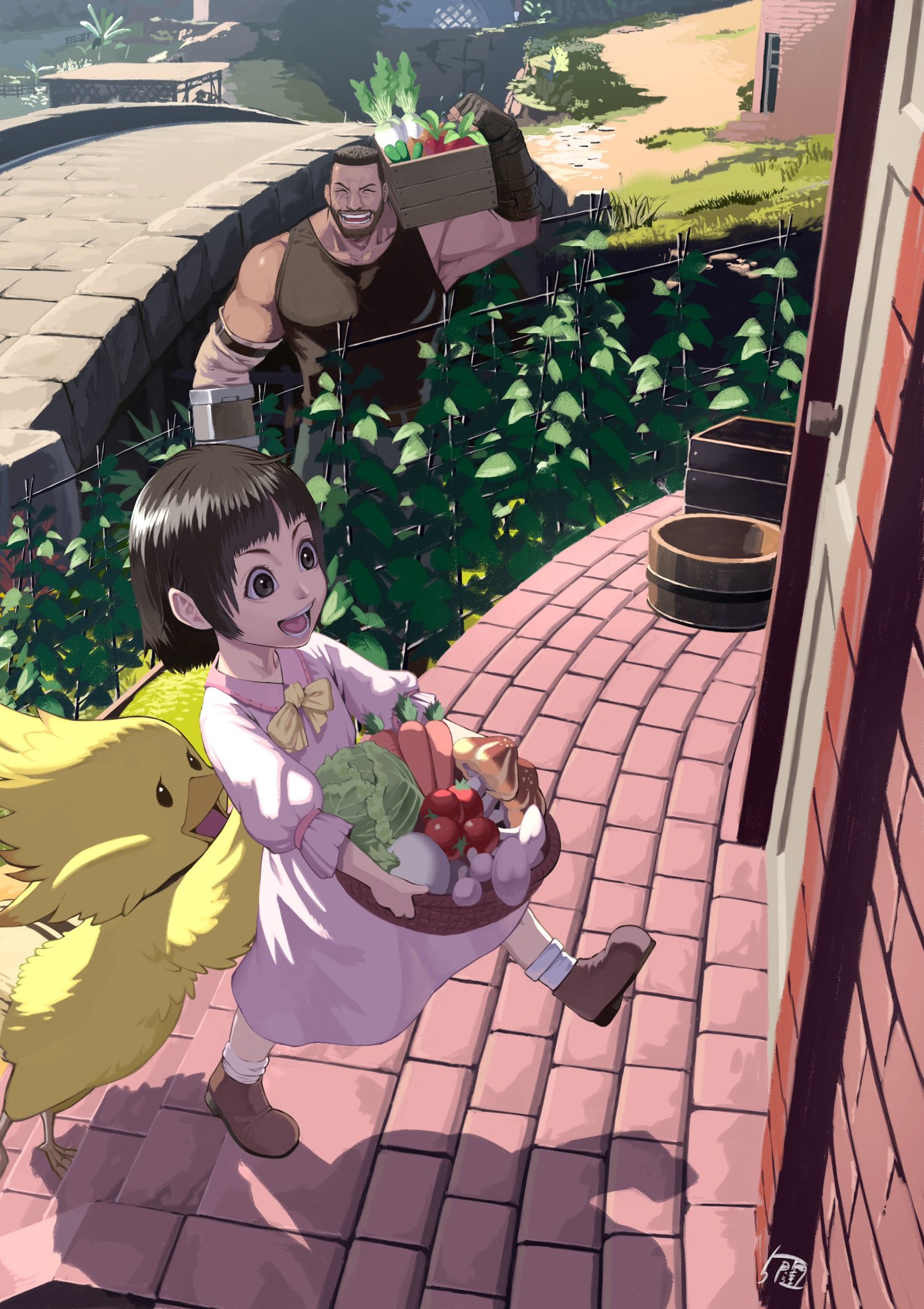 5tatsu bare_shoulders barret_wallace basket beard black_tank_top blunt_bangs bow bowtie box brick_floor bridge brown_eyes brown_footwear brown_hair carrot child chocobo closed_eyes collared_dress dark-skinned_male dark_skin dress facial_hair father_and_child father_and_daughter final_fantasy final_fantasy_vii final_fantasy_vii_rebirth final_fantasy_vii_remake food garden highres holding holding_basket holding_box lettuce marlene_wallace muscular muscular_male mushroom open_mouth outdoors parent_and_child pink_dress prosthetic_weapon puffy_sleeves short_hair smile socks tank_top tomato vegetable very_short_hair walking white_socks yellow_bow yellow_bowtie