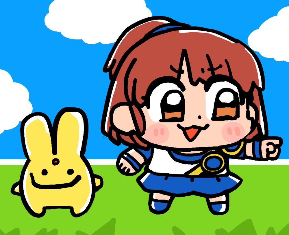 1girl arle_nadja armor bkub blue_footwear blue_shirt blue_skirt blush_stickers breastplate brown_eyes brown_hair carbuncle_(puyopuyo) chibi chibi_only closed_mouth full_body madou_monogatari open_mouth pointing pointing_forward ponytail puyopuyo shirt shoes short_hair shoulder_armor skirt white_shirt wristband