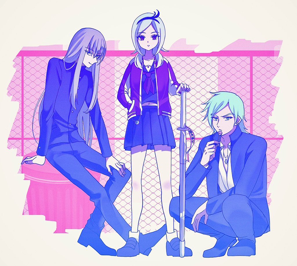 1girl 2boys bare_legs candy closed_mouth crossed_legs delinquent dress earrings eas_(precure) fence food fresh_precure! grey_hair hairband hands_on_own_thighs higashi_setsuna holding holding_food holding_sword holding_weapon jacket jewelry loafers lollipop long_hair multiple_boys neck necklace pants parted_bangs pool pre_greenblue precure ribbon sailor_dress school_uniform shoes skirt sneakers souler_(precure) standing sukajan sword weapon wester_(fresh_precure!)