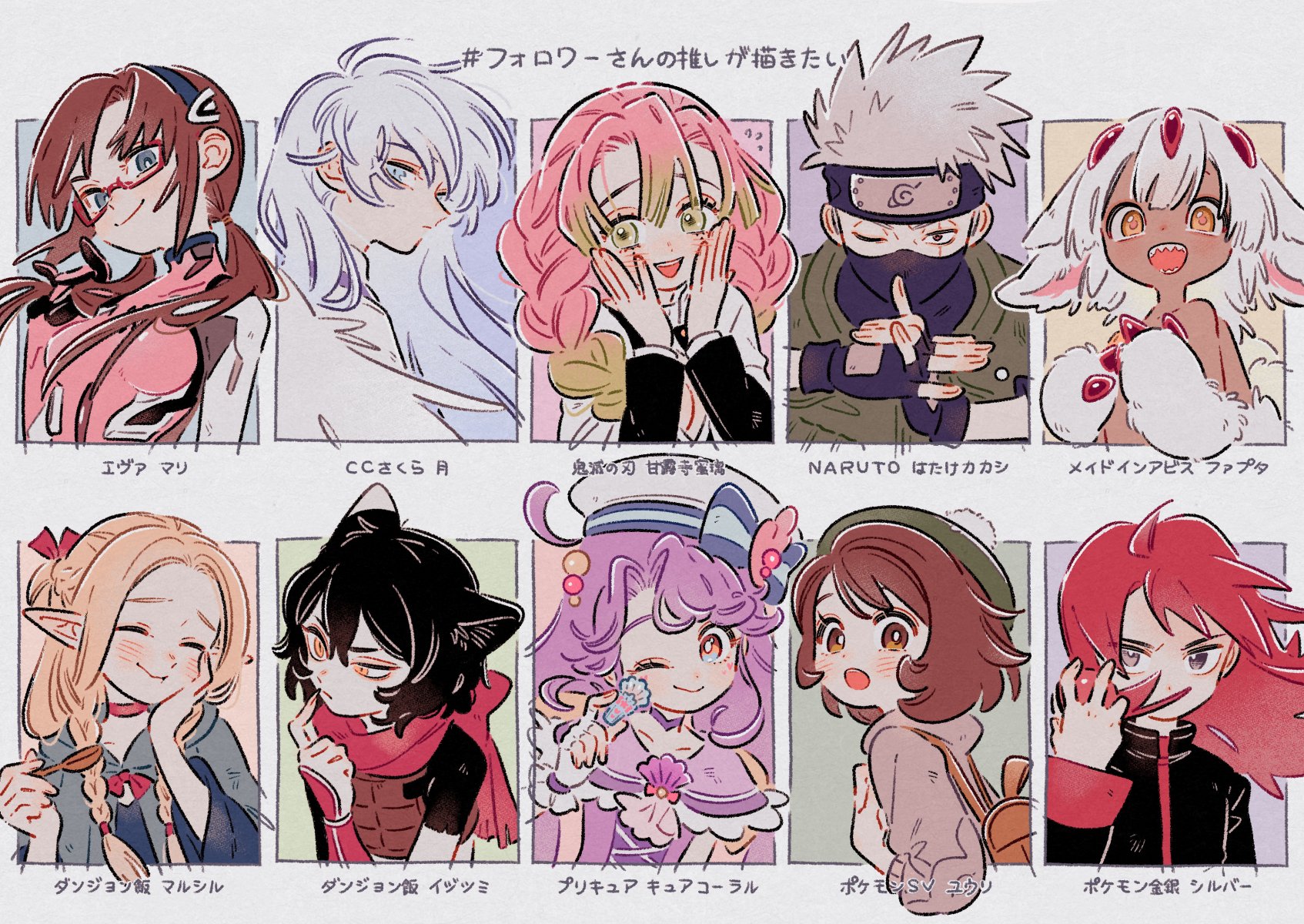 3boys 6+girls :d :o animal_ears backpack bag black_hair black_jacket black_shirt blonde_hair blush bodysuit braid bright_pupils brown_bag brown_eyes brown_hair brown_vest cardcaptor_sakura cardigan character_name closed_eyes closed_mouth copyright_name crossover cure_coral dungeon_meshi faputa fingerless_gloves flak_jacket floating_hair followers_favorite_challenge glasses gloria_(pokemon) gloves green_eyes green_hat green_jacket grey_cardigan grey_hair hand_up hands_up hat hatake_kakashi headband highres holding holding_poke_ball holding_spoon hood hooded_cardigan izutsumi jacket kanroji_mitsuri kimetsu_no_yaiba konohagakure_shinobi_uniform long_hair long_sleeves looking_at_viewer made_in_abyss makinami_mari_illustrious marcille_donato mask mecha_pilot_suit mouth_mask multiple_boys multiple_drawing_challenge multiple_girls naruto_(classic) naruto_(series) neon_genesis_evangelion ninja ninja_mask nintendo oharu-chan open_mouth pink_bodysuit pink_hair plugsuit_(evangelion) pointy_ears poke_ball poke_ball_(basic) pokemon pokemon_gsc pokemon_swsh precure purple_hair rebuild_of_evangelion red_hair red_scarf scarf shirt short_hair silver_(pokemon) smile spiked_hair spoon tam_o'_shanter teeth translation_request tropical-rouge!_precure upper_teeth_only vest white_pupils yue_(cardcaptor_sakura)
