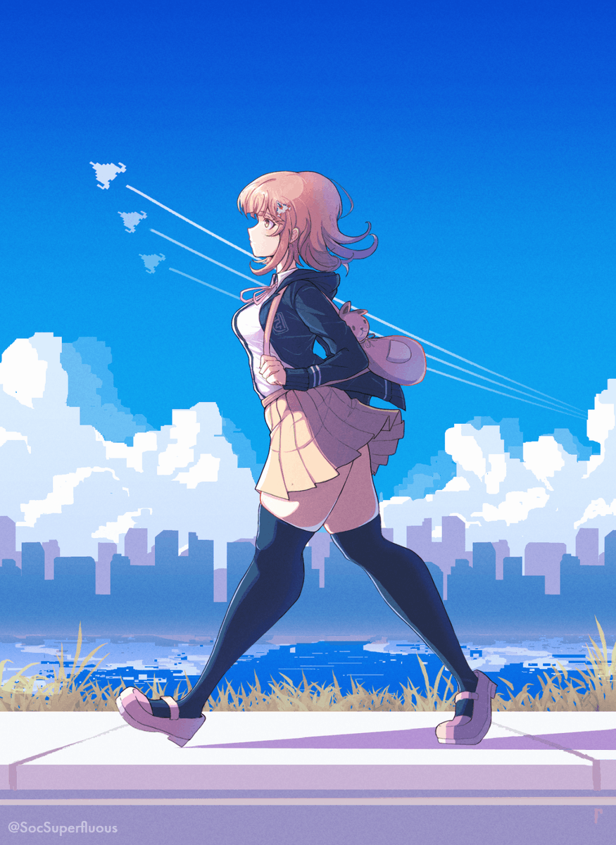 1girl aircraft airplane animal_bag artist_name black_thighhighs breasts brown_hair brown_skirt cat_bag cityscape danganronpa_(series) danganronpa_2:_goodbye_despair day dress_shirt flipped_hair from_side hair_ornament highres hood hood_down hooded_jacket jacket medium_breasts medium_hair nanami_chiaki neck_ribbon open_clothes open_jacket outdoors pink_bag pink_eyes pink_ribbon pink_shoes pleated_skirt ribbon shirt shoes skirt solo soshu_(soshuscribbles) thick_thighs thighhighs thighs walking water white_shirt