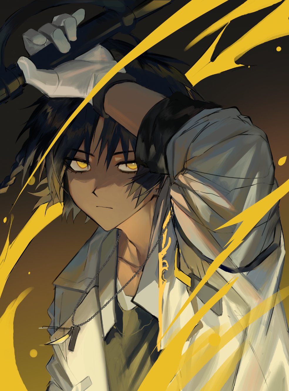 1boy arknights arm_up black_hair black_shirt chain chain_necklace closed_mouth commentary dark-skinned_male dark_skin gloves highres holding jacket jewelry korean_commentary looking_at_viewer magic male_focus necklace open_clothes open_jacket shirt short_hair solo staring t-shirt thorns_(arknights) tzar_game upper_body white_gloves white_jacket yellow_eyes