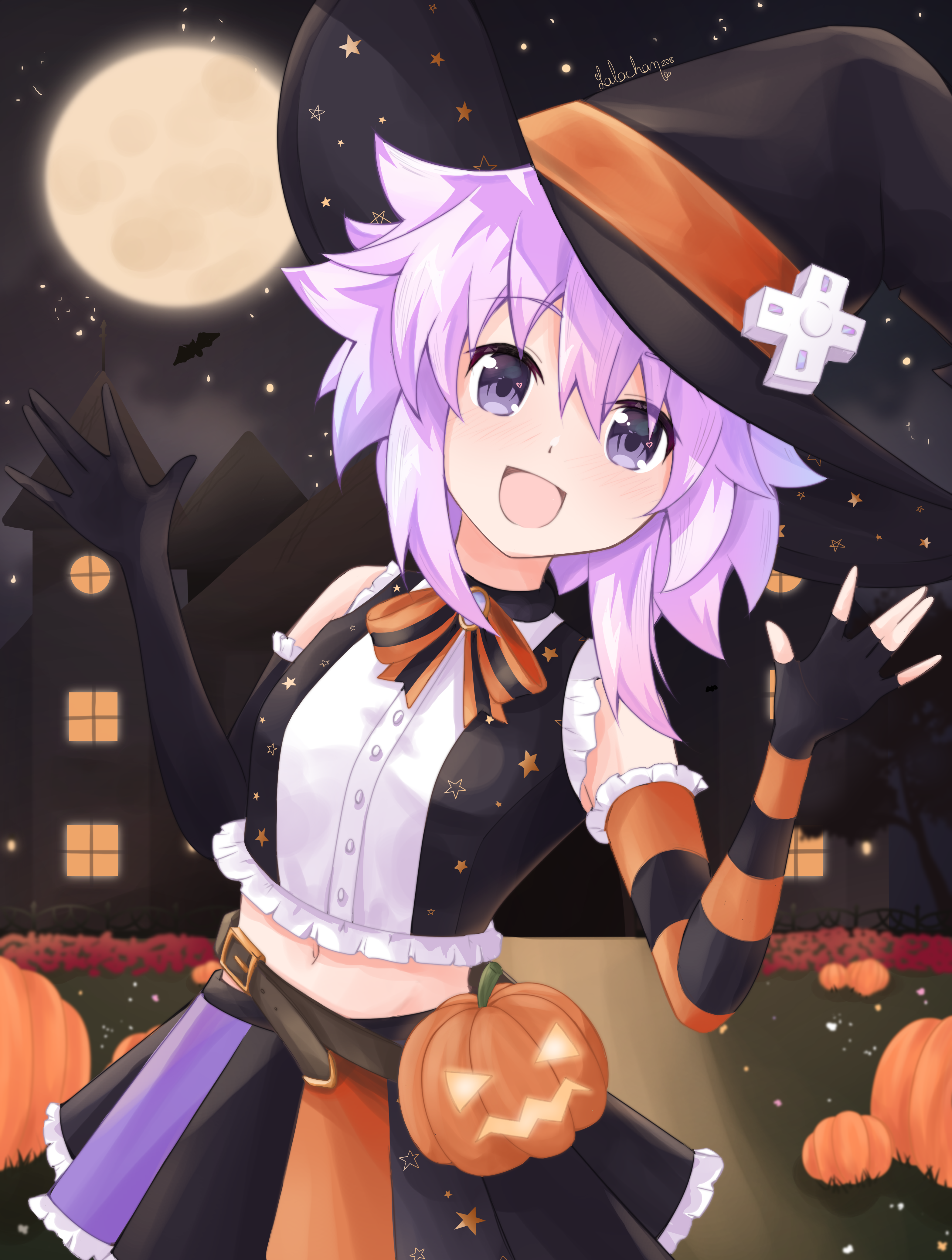 1girl :d \||/ absurdres alternate_costume artist_name asymmetrical_gloves bare_shoulders black_gloves black_hat black_shirt blush choujigen_game_neptune commentary cowboy_shot d-pad elbow_gloves english_commentary eyes_visible_through_hair fingerless_gloves frilled_gloves frilled_shirt frilled_skirt frills full_moon gloves hair_between_eyes halloween halloween_costume hands_up happy hat heart heart_in_eye highres jack-o'-lantern lalachan208 looking_at_viewer medium_hair miniskirt mismatched_gloves moon multicolored_skirt navel neptune_(neptunia) neptune_(series) night open_mouth outdoors outstretched_hand pink_hair pleated_skirt print_headwear print_skirt purple_eyes shirt skirt smile solo spiked_hair star_(symbol) star_print striped_clothes striped_gloves symbol_in_eye tareme two-tone_shirt w_arms white_background witch witch_hat ||/