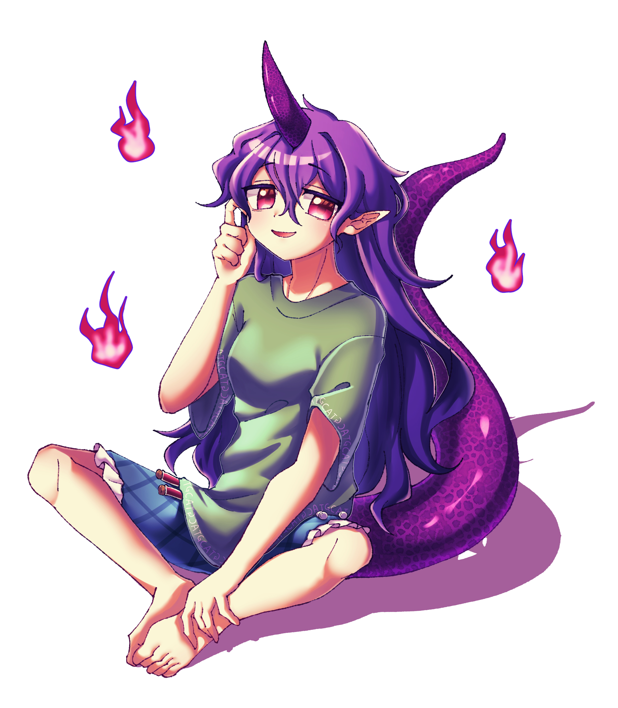 1girl barefoot blue_shorts breasts commentary frilled_shorts frills green_shirt h_(user_cwtm2784) hair_between_eyes highres hitodama horns long_hair open_mouth pointy_ears purple_hair red_eyes shirt short_sleeves shorts single_horn sitting small_breasts smile solo tail tenkajin_chiyari touhou very_long_tail