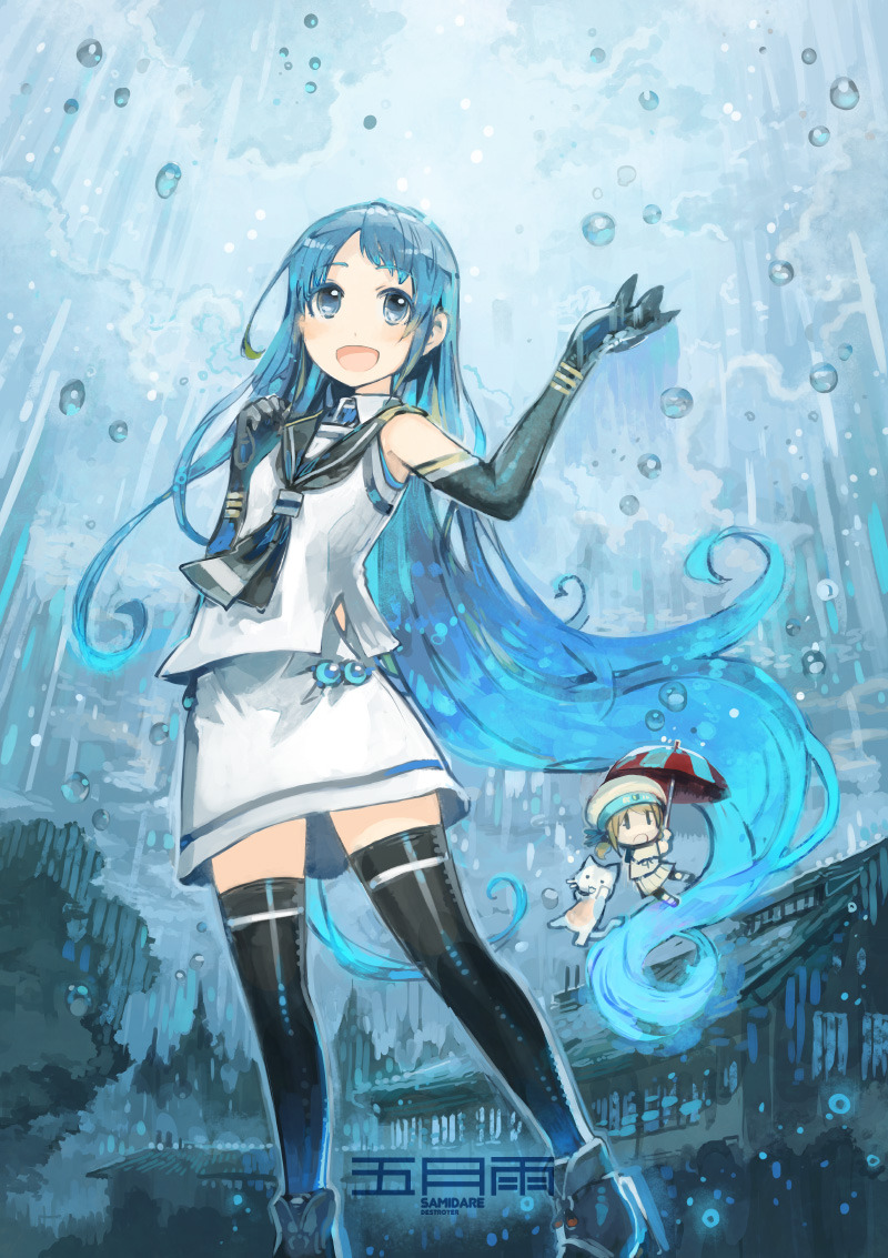 2girls animal aqua_hair black_gloves black_neckerchief black_sailor_collar black_thighhighs blue_eyes blue_hair blush building cat character_name cloud cloudy_sky elbow_gloves fairy_(kancolle) gloves gradient_hair hat kantai_collection konno_takashi long_hair multicolored_hair multiple_girls neckerchief open_mouth outdoors rain sailor_collar samidare_(kancolle) school_uniform serafuku shirt skirt sky sleeveless sleeveless_shirt thighhighs umbrella very_long_hair white_hat white_skirt