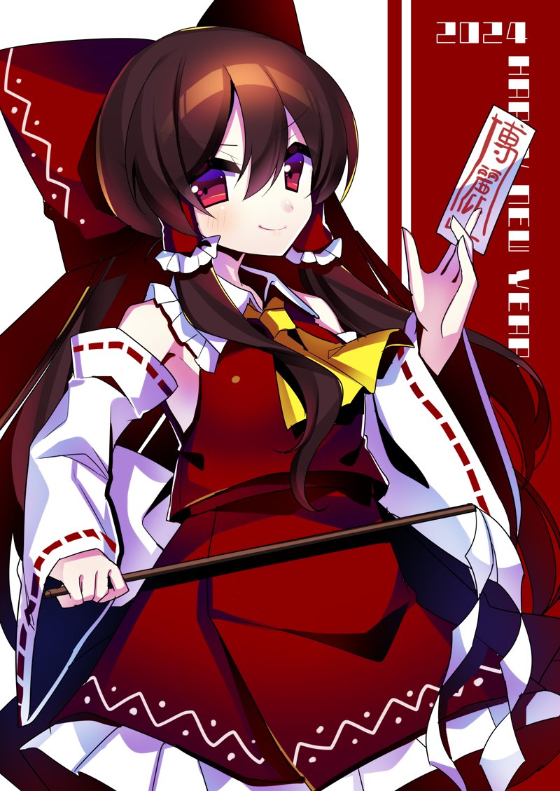 1girl bow breasts brown_hair closed_mouth collared_shirt frills hair_bow hair_tubes hakurei_reimu kujou_mikuru long_hair long_sleeves red_eyes shirt skirt sleeveless sleeveless_shirt smile solo touhou