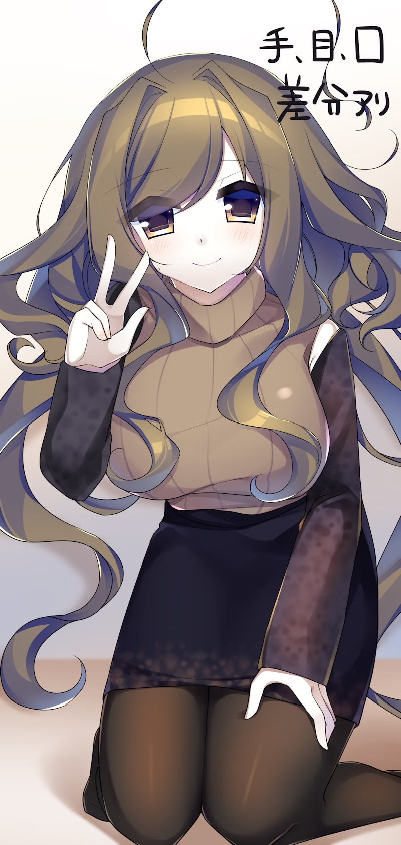 1girl ahoge breasts brown_eyes brown_hair closed_mouth highres kujou_mikuru large_breasts long_hair long_sleeves original skirt smile solo v