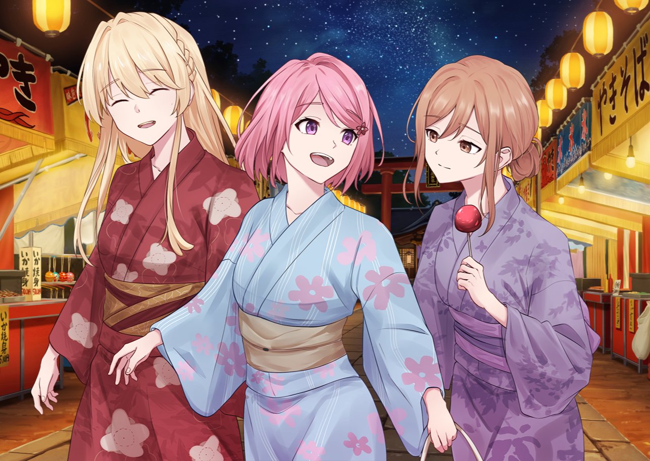 3girls amaori_renako bamboo_print blonde_hair brown_hair candy candy_apple chxoswolf floral_print food holding holding_candy holding_candy_apple holding_food japanese_clothes kimono lantern light_smile multiple_girls ouzuka_mai paper_lantern pink_hair sena_ajisai sky smile star_(sky) starry_sky summer_festival third-party_source watashi_ga_koibito_ni_nareru_wake_naijan_murimuri! yukata