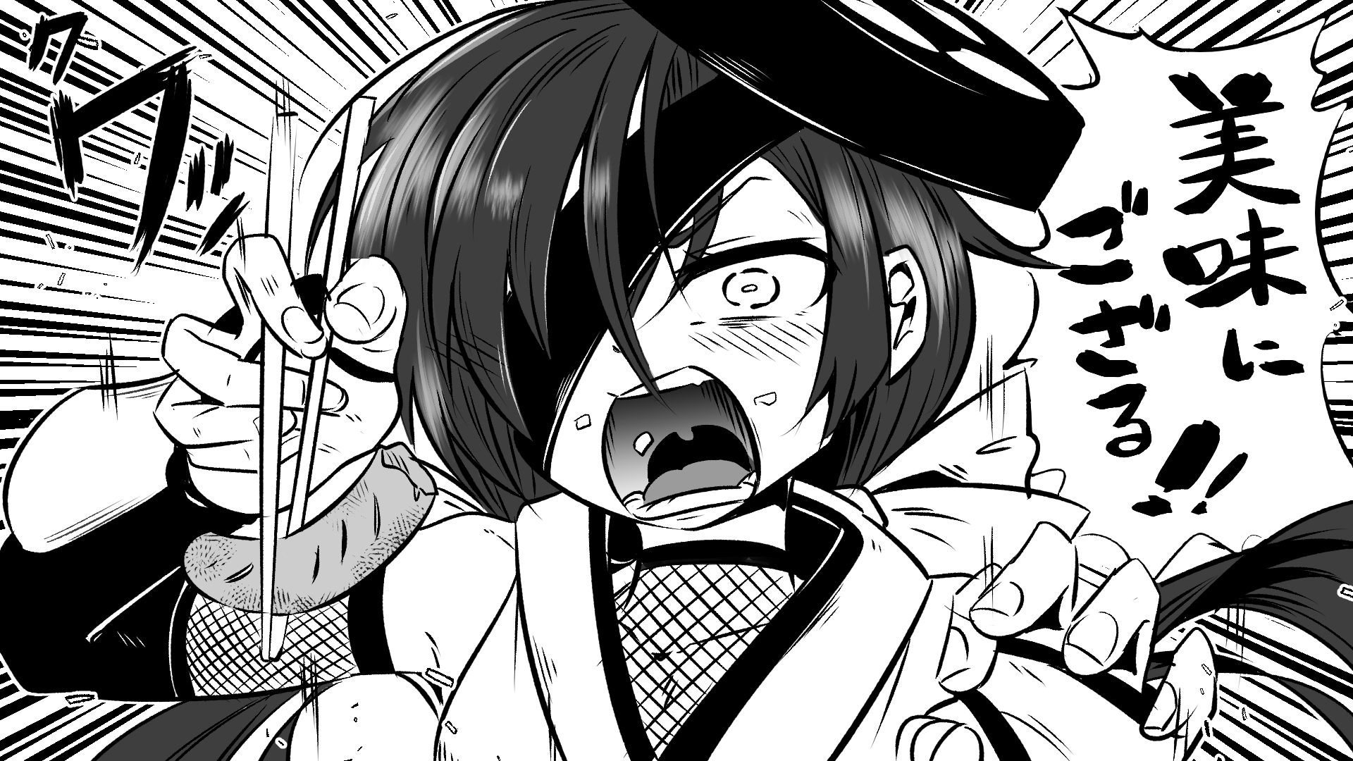 1girl bare_shoulders blush bow chopsticks commentary_request emphasis_lines fate/grand_order fate_(series) fishnets food food_on_face glutton greyscale hair_bow hair_over_one_eye hands_up highres holding holding_chopsticks japanese_clothes kimono long_hair looking_at_viewer mochizuki_chiyome_(fate) mochizuki_chiyome_(second_ascension)_(fate) monochrome neon-tetora open_mouth sausage sleeveless sleeveless_kimono solo translation_request upper_body uvula