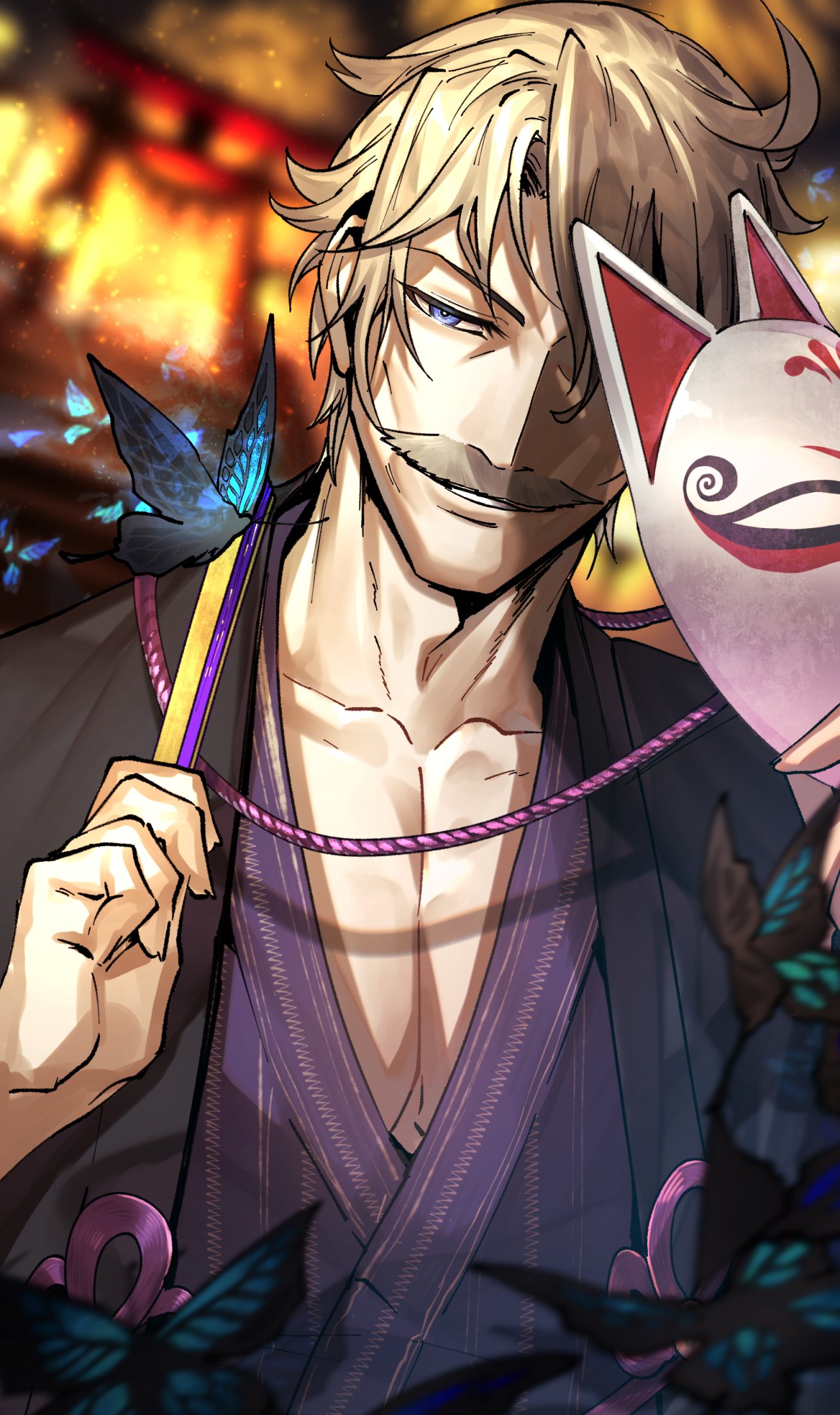 1boy alternate_costume black_kimono blue_butterfly blue_eyes blue_kimono bug butterfly facial_hair fate/grand_order fate_(series) fox_mask grey_hair highres holding insect james_moriarty_(archer)_(fate) japanese_clothes kimono looking_at_viewer male_focus mask mustache old old_man one_eye_covered short_hair smile solo suzuki_rui unworn_mask