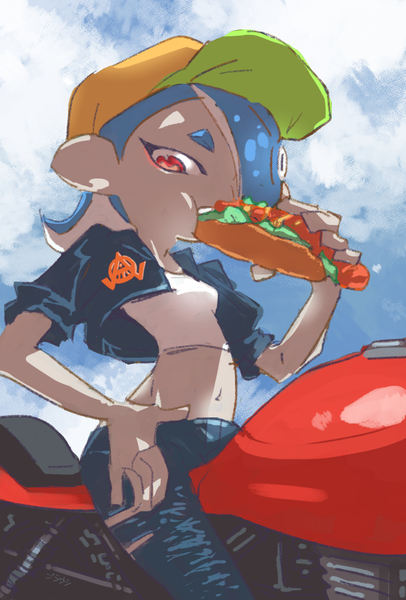 1girl alternate_costume baseball_cap blue_background blue_hair denim eating hair_over_one_eye hand_on_own_hip hat hot_dog jacket jeans leather leather_jacket motor_vehicle motorcycle navel nintendo octoling outdoors pants red_eyes sarumemn shiver_(splatoon) sitting solo splatoon_(series) splatoon_3 tank_top tentacle_hair torn_clothes torn_pants