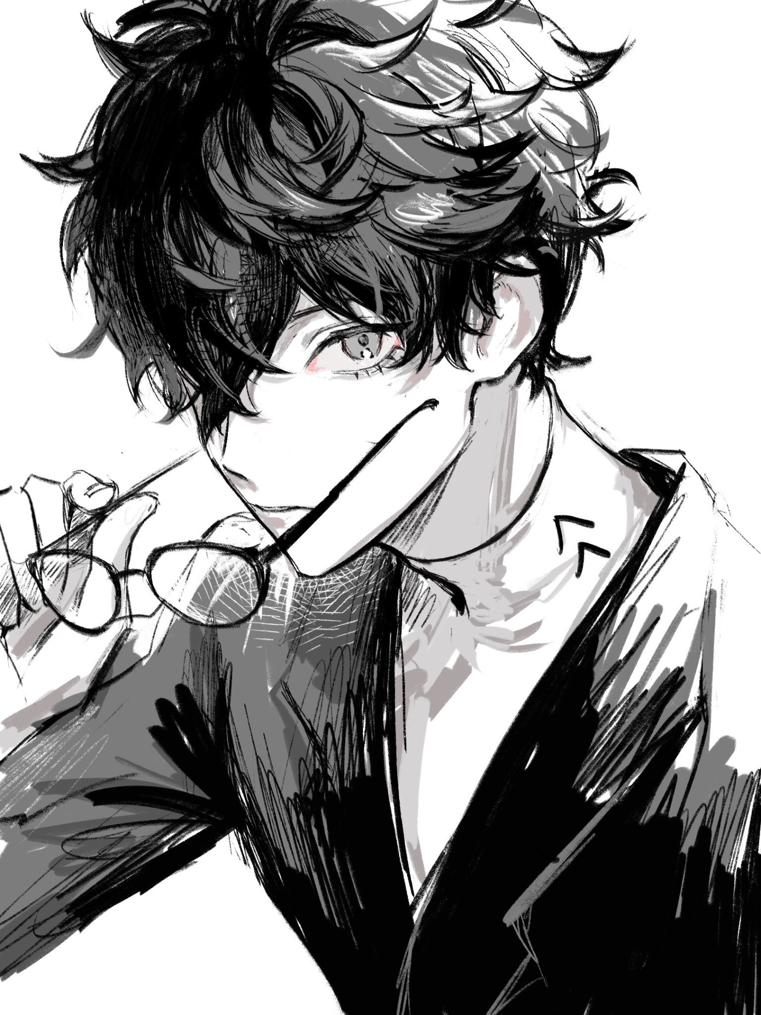 1boy amamiya_ren black-framed_eyewear black_hair e666lofter4 expressionless glasses hair_bet hair_over_one_eye highres holding holding_removed_eyewear long_sleeves looking_at_viewer male_focus persona persona_5 shirt short_hair simple_background solo unworn_eyewear upper_body white_background white_shirt