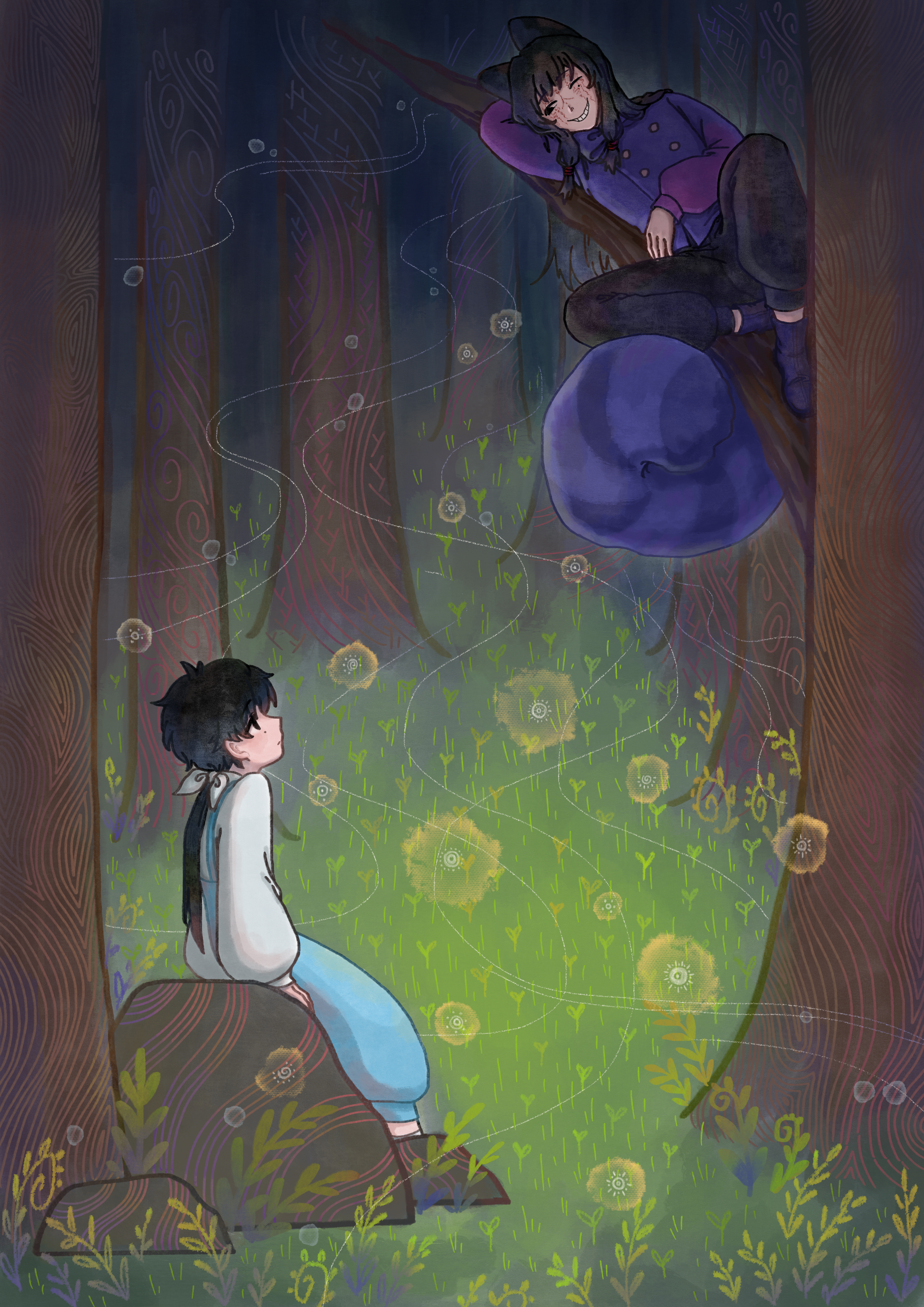 2boys absurdres alice's_adventures_in_wonderland animal_ears black_eyes black_hair black_pants blue_pants bow bowtie buttons cat_boy cat_ears cat_tail cheshire_cat_(alice_in_wonderland) cheshire_cat_(alice_in_wonderland)_(cosplay) chinese_commentary commentary_request cosplay double-breasted facial_tattoo forest grin hair_bow highres in_tree jacket li_yuting_(male) long_hair lying male_focus mole mole_under_eye multiple_boys nature one_eye_closed outdoors pants purple_bow purple_bowtie purple_jacket shirt smile tail tattoo touqi_guaitan tree white_bow white_shirt youyushi ziche_fuzhao