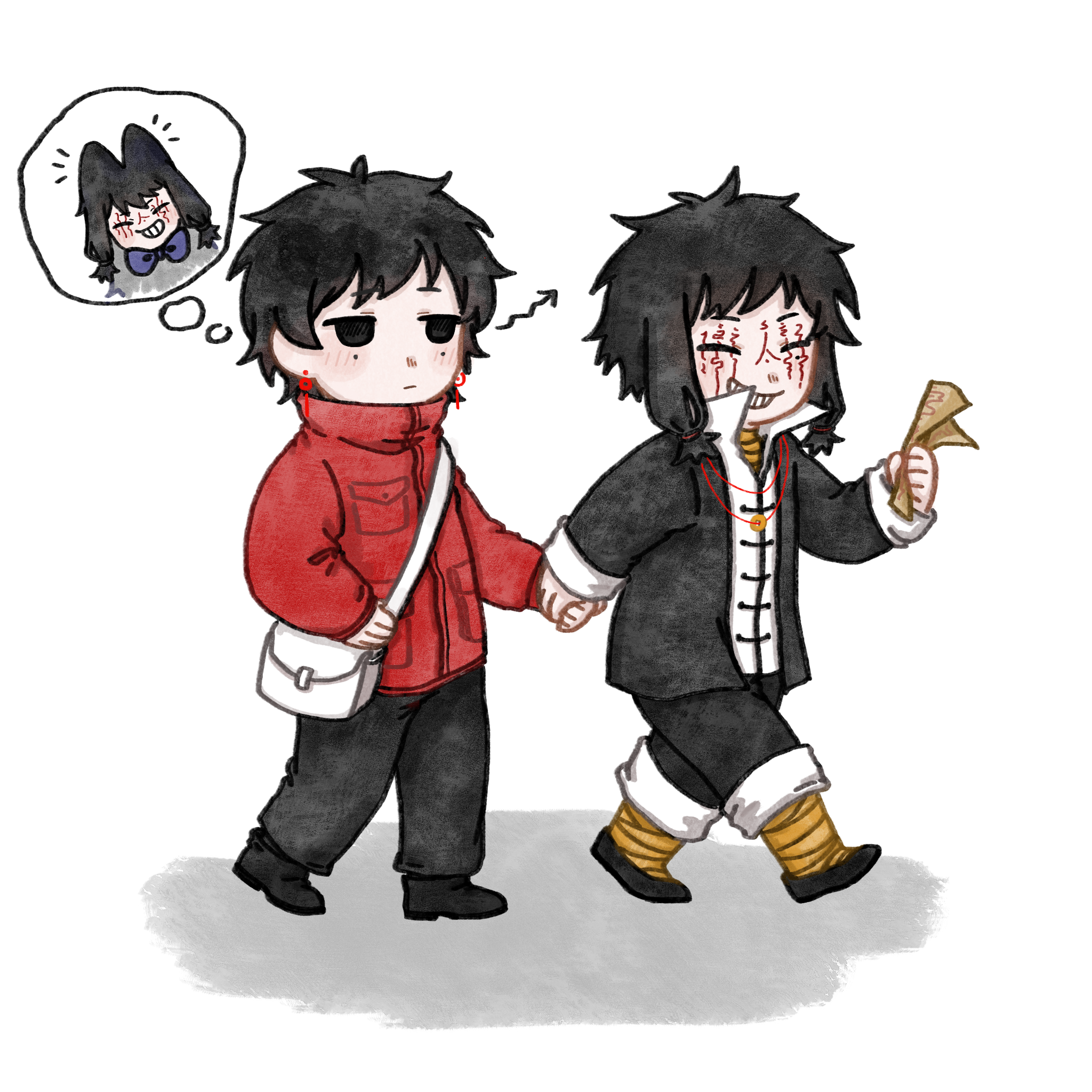 2boys animal_ears bag bandaged_leg bandaged_neck bandages black_eyes black_hair black_jacket black_pants black_shoes cat_boy cat_ears chinese_commentary closed_eyes closed_mouth coin coin_on_string collared_shirt commentary_request deformed earrings expressionless facial_tattoo grin high_collar highres holding holding_hands holding_ofuda holed_coin image_in_thought_bubble jacket jewelry jitome li_yuting_(male) long_sleeves male_focus messenger_bag mole mole_under_each_eye mole_under_eye multiple_boys multiple_moles necklace ofuda open_clothes open_collar open_jacket pants red_jacket shirt shoes short_hair shoulder_bag simple_background smile speech_bubble tattoo thought_bubble touqi_guaitan walking white_background white_bag white_shirt youyushi