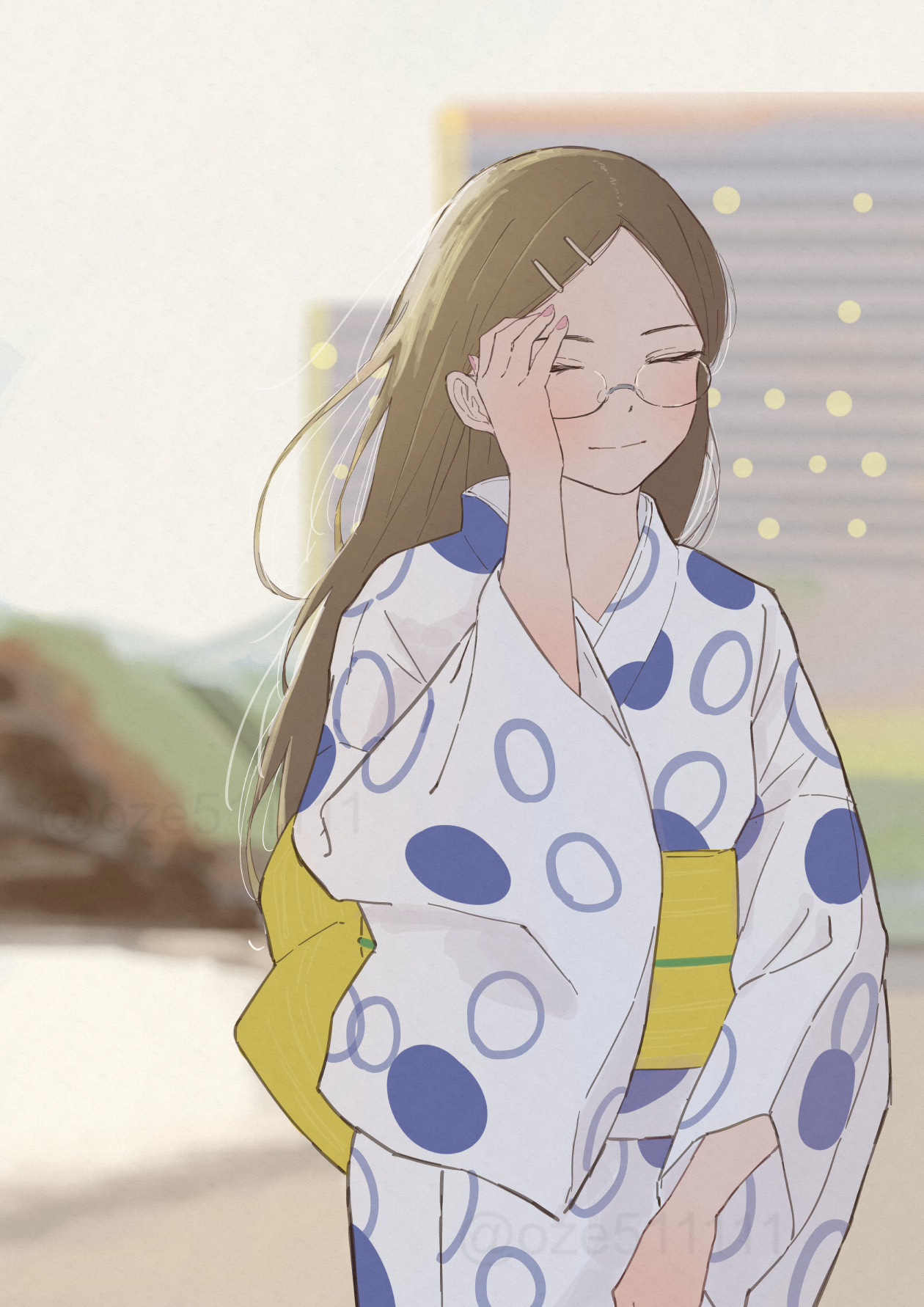 1girl adjusting_hair arm_up blue_kimono blurry blurry_background brown_hair closed_eyes closed_mouth commentary cowboy_shot fingernails glasses hair_ornament hairclip highres japanese_clothes kimono light_blush long_hair obi outdoors oze_(xyz_go_go11) parted_bangs saitou_kaede_(yama_no_susume) sash solo standing two-tone_kimono white_kimono yama_no_susume