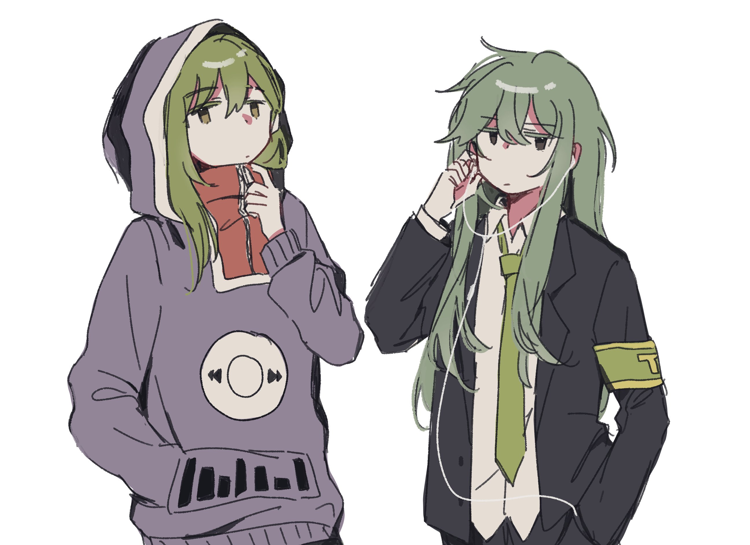 1boy 1girl black_jacket collared_shirt commentary cosplay costume_switch green_necktie headphones highres hood hood_up hoodie jacket kagerou_project keicorporationz kido_tsubomi kido_tsubomi_(cosplay) lobotomy_corporation look-alike looking_at_viewer necktie netzach_(project_moon) netzach_(project_moon)_(cosplay) project_moon purple_hoodie shirt white_shirt wing_collar