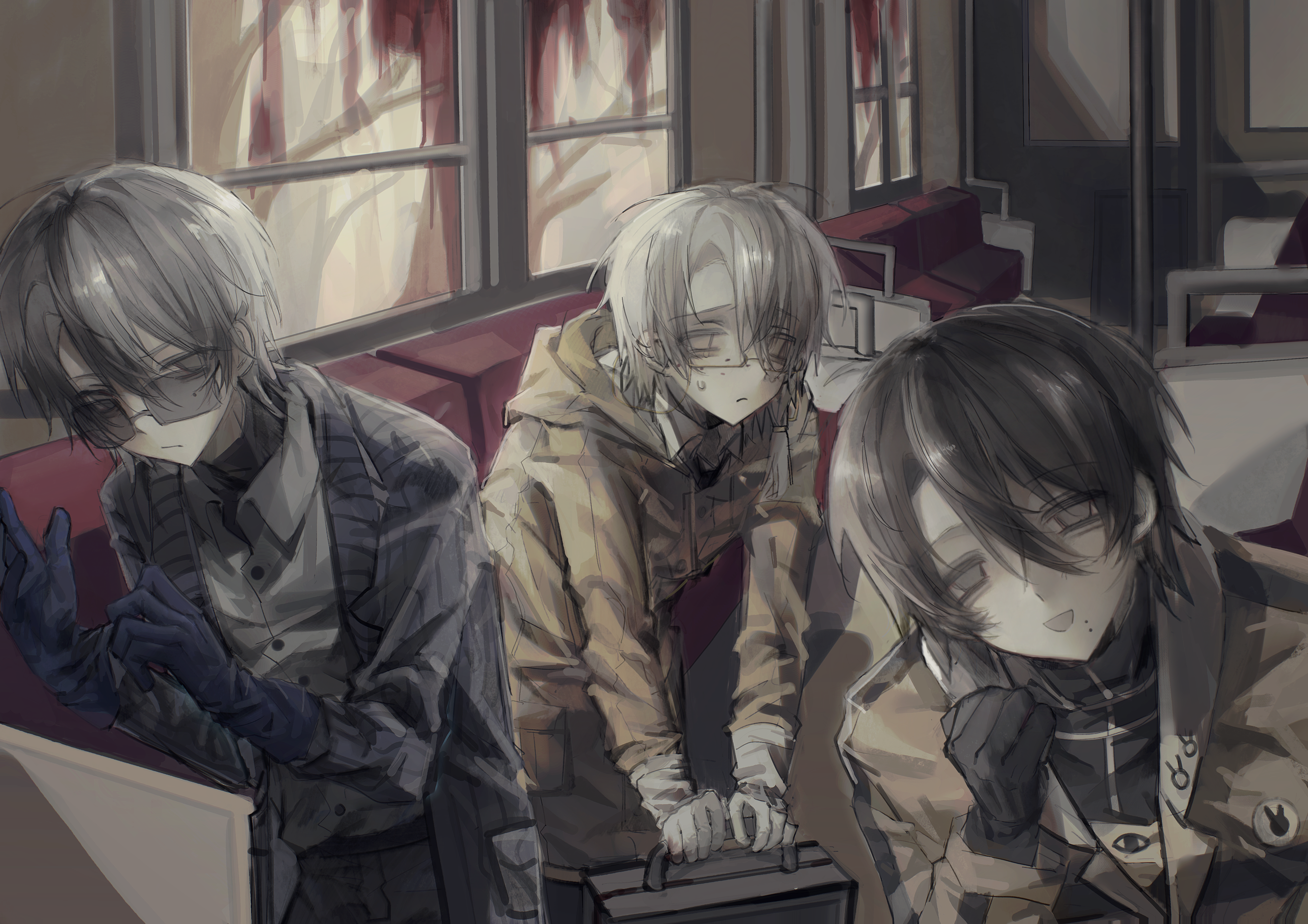 3boys absurdres bai_ling_(touqi_guaitan) black_coat black_gloves black_hair black_pants black_shirt blue_eyes briefcase brown_jacket coat collared_shirt eyewear_strap glasses gloves grey_eyes grey_hair grey_shirt hair_between_eyes highres holding holding_briefcase indoors jacket liu_qingcheng long_sleeves male_focus mole mole_under_eye mole_under_mouth multiple_boys multiple_moles open_mouth pants procreate_(medium) rectangular_eyewear semi-rimless_eyewear shi_zhaoying shirt short_hair smile sweat touqi_guaitan turtleneck white_hair women_tao_ba yellow-framed_eyewear yellow_coat yellow_eyes